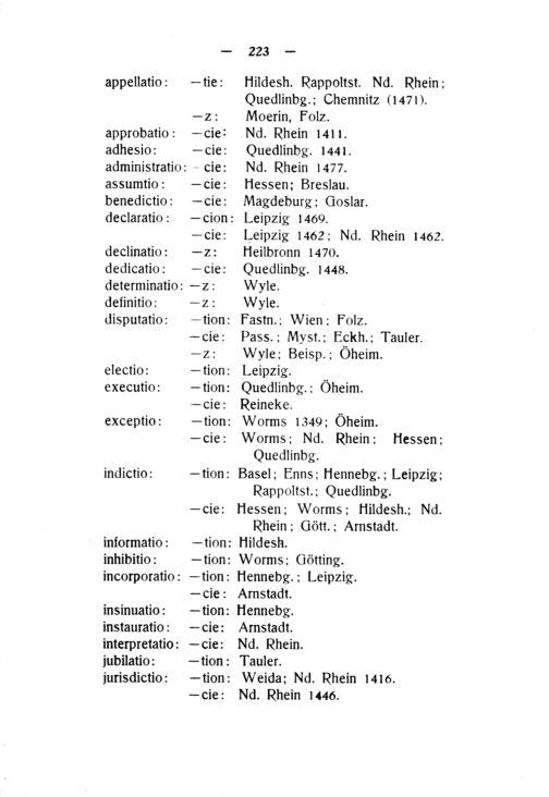 appellatio:— tie: Hildesh. Rappoltst. Nd. Rhein; Quedlinbg.; Chemnitz(1471). — 2: Moerin, Folz. approbatio:— cie: Nœ. hein 1411. adhesio:— cie: Quedlinbg. 1441. administratio:— cie: Nd. Rhein 1477. assumtio:— cie: Hessen; Breslau. benedictio:— cie: Magdeburg; Goslar. declaratio:— cion: Leipzig 1460. — cie: Leipzig 1462; Nd. Rhein 1462. declinatio:— 2: Heilbronn 1470. dedicatio:— cie: Quedlinbg. 1448. determinatio:— 2: Wyle. definitio:— 2: Wyle. disputatio:— tion: Fastn.: Wien; Folz. — cie: Pass.; Myst.; Eckh.; Tauler. — z: Wyle; Beisp.; Oheim. electio:— tion: Leipzig. executio:— tion: Quedlinbg.: Oheim. — cie: Reineke. exceptio:— tion: Worms 1349; Oheim. — cie: Worms; Nd. Rhein: Hessen; Quedlinbg. indictio:— tion: Basel; Enns; Hennebg.; Leipzig; Rappoltst.; Quedlinbg. — cie: Hessen; Worms; Hiildesh.; Nd. Rhein; Gött.; Arnstadt. informatio:— tion: Hildesh. inhibitio:— tion: Worms; Götting. incorporatio:— tion: Hennebg.: Leipzig. — cie: Arnstadt. insinuatio:— tion: Hennebg. instauratio:— cie: Arnstadt. interpretatio:— cie: Nd. Rhein. jubilatio:— tion: Tauler. jurisdictio:— tion: Weida; Nd. Rhein 1416.