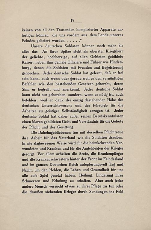 Die Daheimgebliebenen tun mit derselben Pflichttreue ihre Arbeit für das Vaterland wie die Soldaten draußen. In nie dagewesener Weise wird für die heimkehrenden Ver- wundeten und Kranken und für die Angehörigen der Krieger gesorgt. Vor allem arbeiten die Arzte, die Krankenpfleger und die Krankenschwestern hinter der Front im Feindesland und im ganzen Deutschen Reich aufopferungsvoll Tag und Nacht, um den Helden, die Leben und Gesundheit für uns alle aufs Spiel gesetzt haben, Heilung, Linderung ihrer Schmerzen und Erholung zu schaffen. Aber auch jeder andere Mensch versucht etwas zu ihrer Pflege zu tun oder die draußen stehenden Krieger durch Sendungen ins Feld