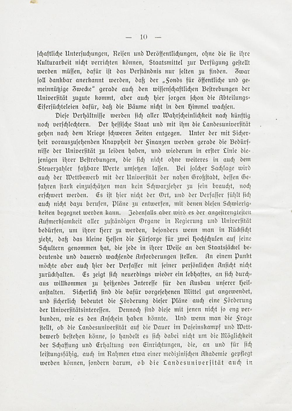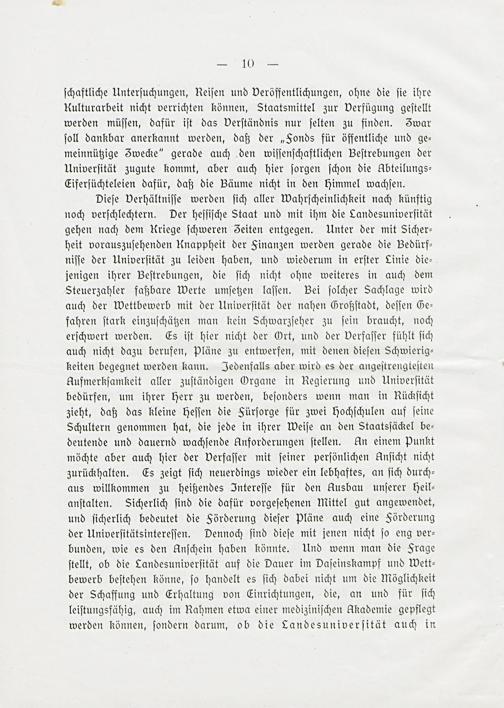 ſchaftliche Unterſuchungen, Reiſen und Veröffentlichungen, ohne die ſie ihre Rulturarbeit nicht verrichten können, Staatsmittel zur Verfügung geſtellt werden müſſen, dafür iſt das Verſtändnis nur ſelten zu finden. S5war ſoll dankbar anerkannt werden, daß der„Fonds für öffentliche und ge⸗ meinnützige Swecke“ gerade auch den wiſſenſchaftlichen Beſtrebungen der Univerſität zugute kommt, aber auch hier ſorgen ſchon die Abteilungs⸗ Eiferſüchteleien dafür, daß die Bäume nicht in den himmel wachſen. Dieſe Verhältniſſe werden ſich aller Wahrſcheinlichkeit nach künftig noch verſchlechtern. Der heſſiſche Staat und mit ihm die Landesuniverſität gehen nach dem Uriege ſchweren Seiten entgegen. Unter der mit Sicher⸗ heit vorauszuſehenden Knappheit der Finanzen werden gerade die Bedürf⸗ niſſe der Univerſität zu leiden haben, und wiederum in erſter Linie die⸗ jenigen ihrer Beſtrebungen, die ſich nicht ohne weiteres in auch dem Steuerzahler faßbare Werte umſetzen laſſen. Bei ſolcher Sachlage wird auch der Wettbewerb mit der Univerſität der nahen Großſtadt, deſſen Ge⸗ fahren ſtark einzuſchätzen man kein Schwarzſeher zu ſein braucht, noch erſchwert werden. Es iſt hier nicht der Ort, und der Derfaſſer fühlt ſich auch nicht dazu berufen, Pläne zu entwerfen, mit denen dieſen Schwierig⸗ keiten begegnet werden kann. Jedenfalls aber wird es der angeſtrengteſten Aufmerkſamkeit aller zuſtändigen Organe in Regierung und Univerſität bedürfen, um ihrer herr zu werden, beſonders wenn man in KRKückſicht zieht, daß das kleine heſſen die Fürſorge für zwei hHochſchulen auf ſeine Schultern genommen hat, die jede in ihrer Weiſe an den Staatsſäckel be⸗ deutende und dauernd wachſende Anforderungen ſtellen. An einem Punkt möchte aber auch hier der Verfaſſer mit ſeiner perſönlichen Unſicht nicht zurückhalten. Es zeigt ſich neuerdings wieder ein lebhaftes, an ſich durch— aus willkommen zu heißendes Intereſſe für den Ausbau unſerer heil⸗ anſtalten. Sicherlich ſind die dafür vorgeſehenen Mittel gut angewendet, und ſicherlich bedeutet die Förderung dieſer pläne auch eine Sörderung der Univerſitätsintereſſen. Dennoch ſind dieſe mit jenen nicht ſo eng ver⸗ bunden, wie es den Anſchein haben könnte. Und wenn man die Frage ſtellt, ob die Candesuniverſität auf die Dauer im Daſeinskampf und Wett⸗ bewerb beſtehen könne, ſo handelt es ſich dabei nicht um die Möglichkeit der Schaffung und Erhaltung von Einrichtungen, die, an und für ſich leiſtungsfähig, auch im Rahmen etwa einer mediziniſchen Akademie gepflegt werden können, ſondern darum, ob die Landesuniverſität auch in