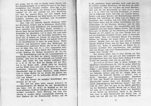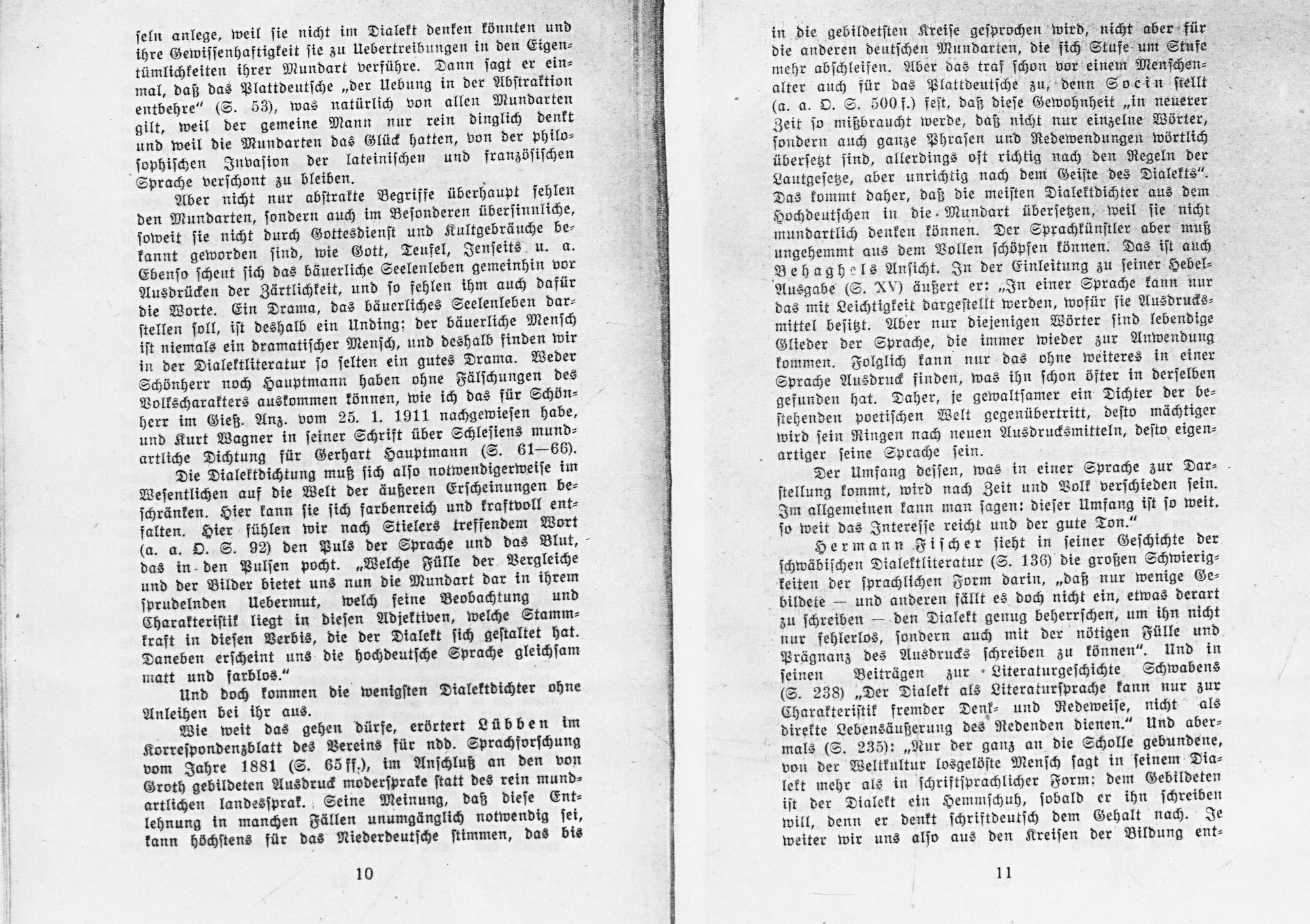 Prägnanz des Ausdrucks ſchreiben zu können“. Und in ſeinen Beiträgen zur Literaturgeſchichte Schwabens (S. 238)„Der Dialekt als Literaturſprache kann nur zur Charakteriſtik fremder Denk⸗ und Redeweiſe, nicht als direkte Lebensäußerung des Redenden dienen.“ Und aber⸗ mals(S. 235):„Nur der ganz an die Scholle gebundene, von der Weltkultur losgelöſte Menſch ſagt in ſeinem Dia⸗ lekt mehr als in ſchriftſprachlicher Form: dem Gebildeten iſt der Dialekt ein Hemmſchuh, ſobald er ihn ſchreiben will, denn er denkt ſchriftdeutſch dem Gehalt nach. Je weiter wir uns alſo aus den Kreiſen der Bildung ent⸗