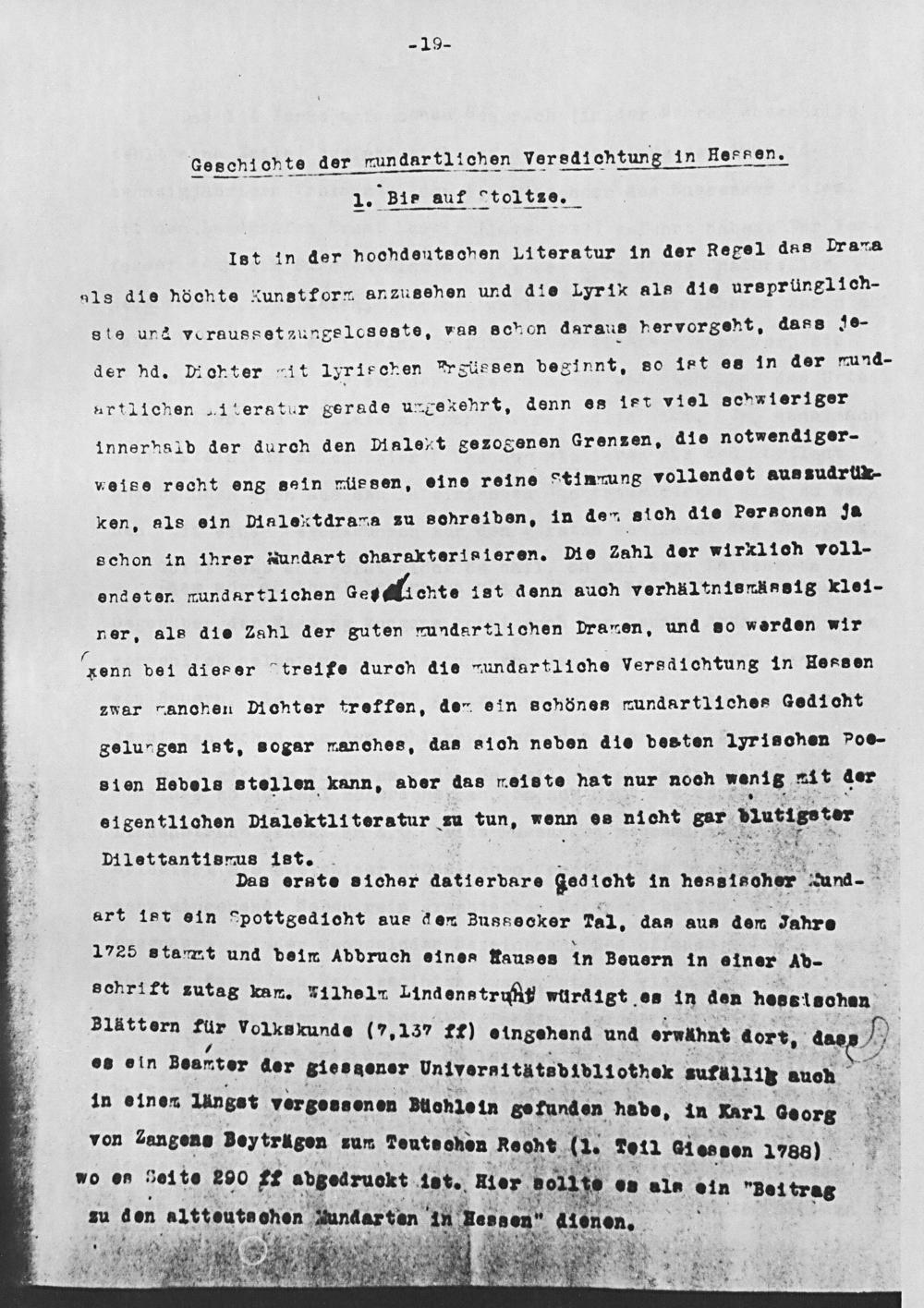 der nd. Dchter it lyris ehen vrgüssen beginnt, so iat es in der nund artlichen i terstur gerade urcekehrt, denn es 1st vI1 schwieriger innerhalb der durch den Dialent gezogenen Grenzen, die notwendiger- weise recht eng sein müssen, eine reine Stinrung vollendet aus sudrük- Kken, als ein Dialewtdrana zu sehreiben, in den sich die Personen a schon in ihrer Nundart charakterisieren. Die zahl der wirklieh vol*1- endeter mundartlichen Ge*⁴ͥiehte i1st denn auch verhältnisnäiseig klei- ner, als die Zahl der guten nundartlichen pranen, und so worden wir (Lenn bei dieser treilfe durch die zundartliche versdichtung in Hessen zwar ganchen Dichter treffen, der ein schönes nundartliches Godicht gelungen ist, sogar manches, das sich neben die beesten lyrischen Poe- 3 sien Hebels stoellen kann, aber das. 1e te nat nur nooch venig 221 t der