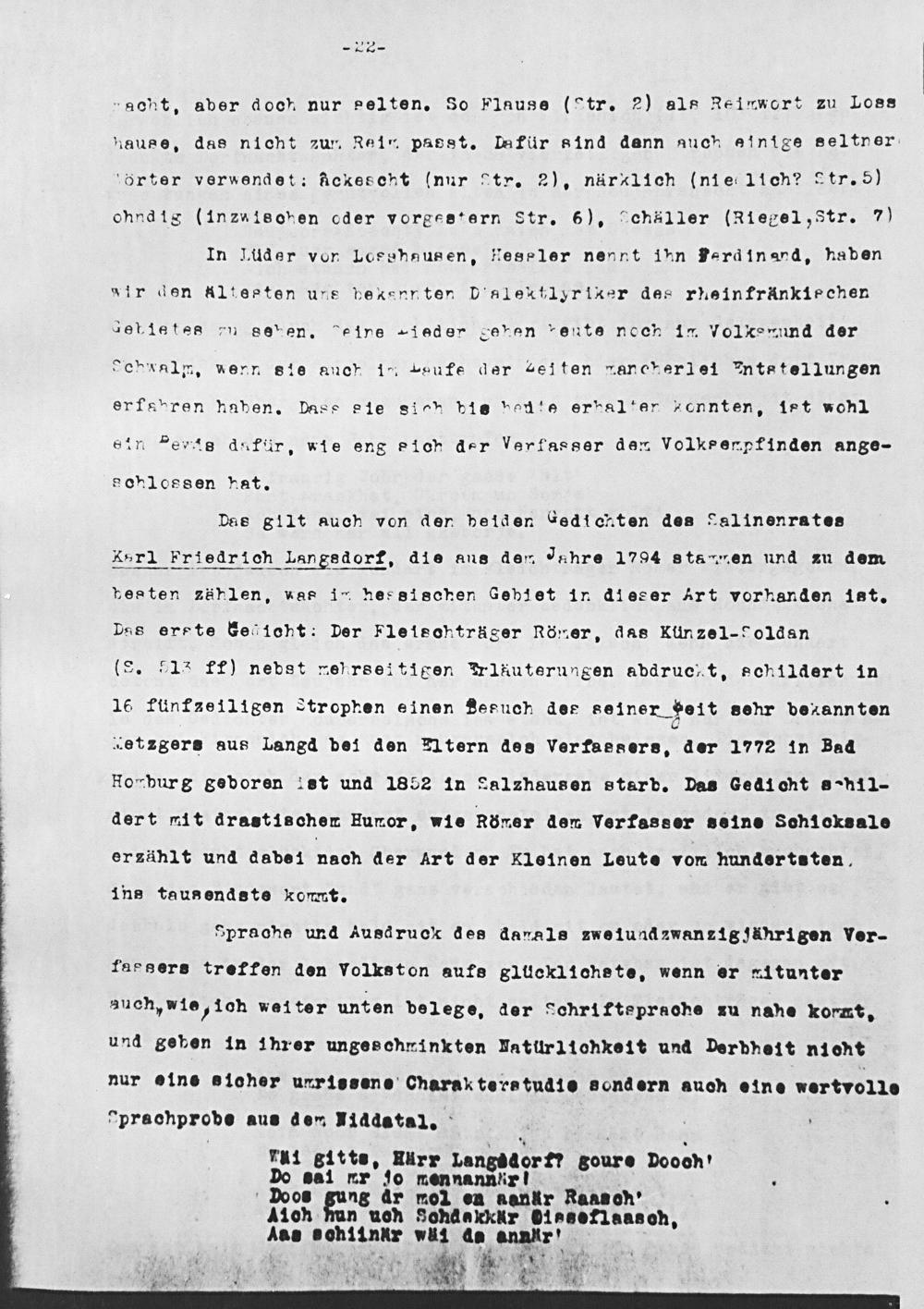 besten zählen, uas irn hessischen Gebiet in dieser Art vorhanden ist. Pas erste Geioht: Der Fleischträger Römer, das Künzel-oldan (S. 5135 ff) nebst nehrseitigen lkuterungen abdrucht, schildert in 16 fünfzeiligen Strophen einen Besuch des seiner Heit sehr bexannten wetzgers aus Langd bei den ltern des Verfassers, der 1772 in Bad Honburg geboren leat und 1852 in Salzhausen starb. Das Gedicht a-h1 1- dert mit drastischen Humor, wie Römer dem Verfasser seine Schioksale erzählt und dadei nach der Art der Kleinen Leute vom hundertaten, ins tausendste komt.