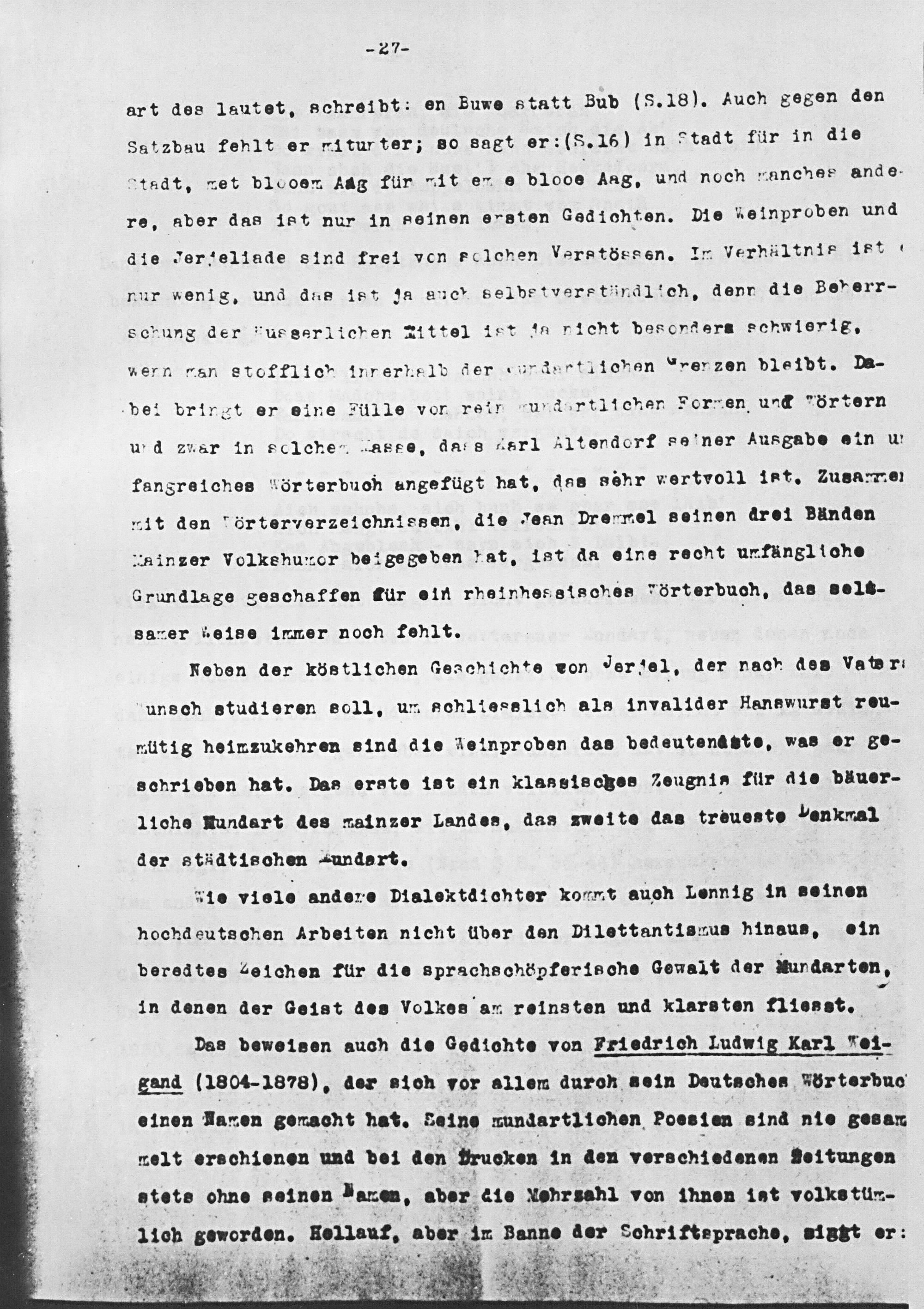 510 vi110 andere Dialektdichter konnt auoch Lennig in soinen nochd eutschen Arbeiten nicht über den Dilettantisnus hinaus, oin deredtes zeichen für die sprachschöpferische Geualt der nurdarten, in denen der deiat des Volkes ar reinsten und klarsten fliesst. 4