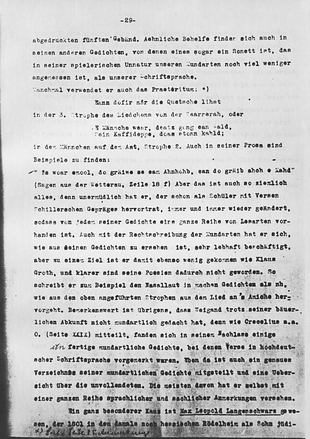 — de woar emool, do gräilwe se ean Ahnhohb, ean do gräib ahon e xahd“ (Sagen aus der Ketterau, Zeile 18 f) Aber das 1at auch 80 si enlich alles, denn unermüdlich nat er, der schon als Schüler Mit Vorsen dchillereschen Gepräges hervortrat, iwEer und inmer wieder geündert. sodass von leden seiner Gedichte eire ganze Reihe von Lesarten vor- nand en 1st. huch it der Rechtsobrei bung der xundarten hat er sich, wie aus deinen Gedichten zu ersehen iet, eehr lebhaft beschkftigt, aber au einen 21 e1 ist er danit ebenso wenig gekonmen vie Klaus Groth. und klarer sind soine Poesien dadureh nieht gewordon. 80 schreibt er sun Belspiel den Hasallaut in rachan 2diohtan 21⸗ nh. 3 wie aus den oben ange fünrten Strophen aus dem L14 an. Amiehe ner. vorgeht. Bewerkenswert iat übrigens, dass Veisand trots soiner däuer- l1 chen Abkunft nioht mundar tlich gedacht hat, denn„10 Crooel ius a. a. O.(Soite MIX) mitteilt. fanden aich in noinem TacOhlase oinige.
