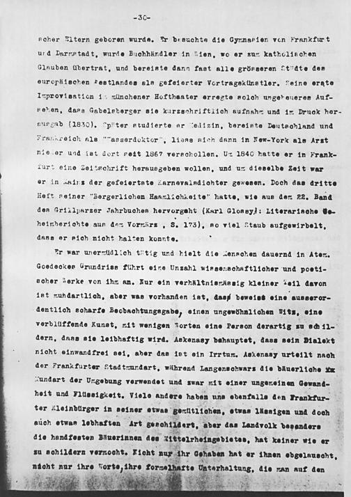 scher Bltern geboren vurde. Ur besuchte die Gynnasien von Frankfur t urd Parns tadt, wurde Buchhändler in"ien, wo er zun katholischen Glauben übertrat, und bereiste dann fast alle gröseeren Stidte des eur opäiechen restlandes als gefeierter Vortragskünstler. Seine erate Inppovisation i- wünchener Hoftheater erregte soloh ungereueree Auf- sehen, dass Gabelsberser sie kurzschriftlich aufnahn und in Druck her- ausgab(1830). Spöter studierte er tedizin, bereiste Deutschland und Frannreich als"wasserdoktor, 1iess sien dann in Reu-York als Arst niener und ist dort sett 1867 verschollen. Uz 1840 hatte er in Frank- furt eine Zeitschrift herausgeben wollen, und um dieselbe Zeit war er in aAlns der gefeiertste zarnevalsdichter gewesen. Doch das dritte Heft seiner Bergerlichen Haarli chkeite“ hatte, wie aus den 22. Band des arilparzer Jahrbuches hervorgaht(Karl G1O8SyJ: Literar ische Ge- heimberiechte aus den Vornärs, s. 173). 80 viel Staub aufgevirbelt, dasse er sich nicht halten konnte. 3 ur war uner xdidl tch titig und hielt die zenschen dauernd in Atem. Goedeckes érundrise Führt eine Unzahl wisgsenechaftlicher und pooti¹- scher derke von ih an. Nur ein verhältnismissig kleiner 1011 davon ist undartlich, aber vas vorhanden ist, dass beweies„ine ausseror- dentlich scharfe Boodachtungsgaboe, einen ungewöhnl tchen 11 ts, oine verblfffende Kunst, nit wenigen Sorten eine Person derartig 1u 5⁴ 11- dern, dass ale 1eibhaftig wird. Askenasy bahauptet, dass sein Dialekt nicht einwandfrei sel, aber das ist ein Irrtum. Aekenasy urteilt nach der Frankfurter Stad tnundart, während Langens chvars die bäuerliche x kundart der Uagebung verwendot und zwar mit oiner ungeweinen doewand- heit und VIUaigkeit. Viele andoere habon uns obanfalls den Franxfur- ter Kleinbürger in seiner"tae gomutliohan, otwas lüeaigen und doch aüon otwas lebhaften Art 6esoh 114 ert, abor das Landvolk bependers