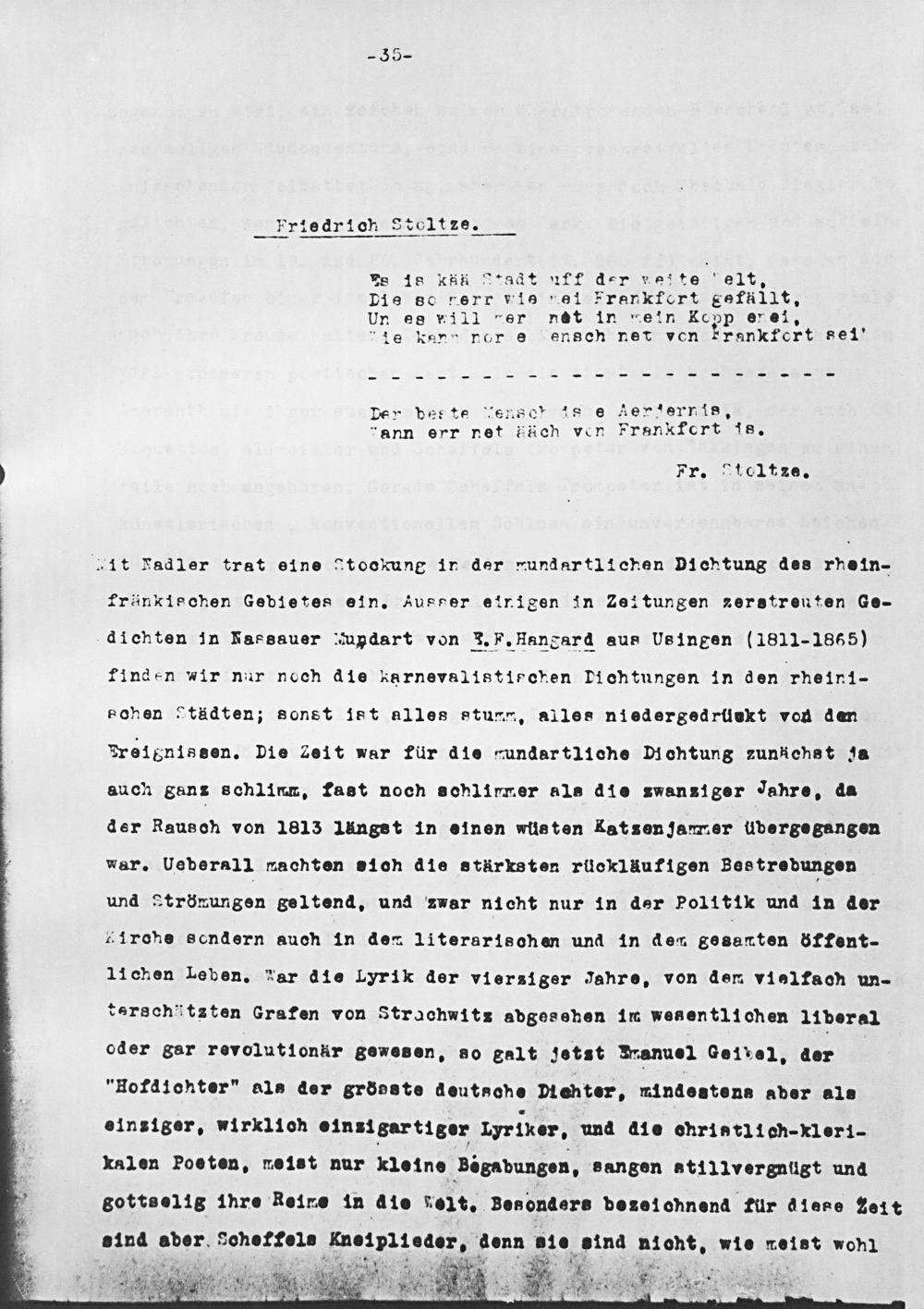 „it Fadler trat eine Stookung in der rundartlichen Dichtung des rhein- fränkischen Gebietes ein., Zusser einigen in Zeitungen zerstreuten Ge- dichten in Nassauer updart von. F. Hangard aus Usingen(1811-1865) finden wir nur noch die karnevalistischen Dichtungen in den rheini- Schen Städten; sonst ist alles stunn, alles niedergedrüukt von den preignissen. Die zeit war für die nundartliche Dichtung zunäichst ja auch ganz schlimm, fast noch achlirmer als die szwanziger Jahre, da
