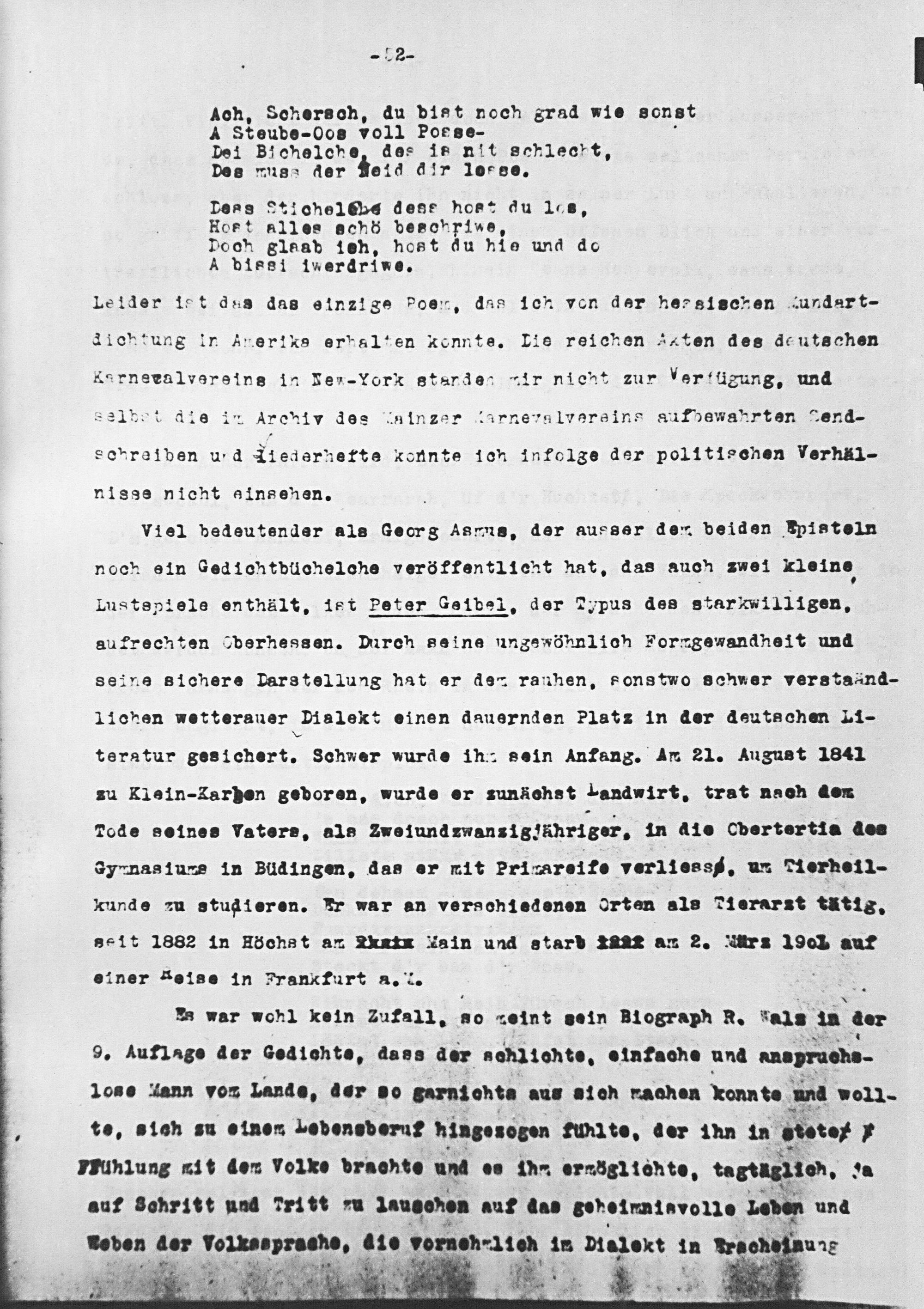 A dissi 1werdrive. Lelder inst dus das einzige bPoez, das ich von der hessischen undart- dAichtung In Zuerike erbal en Konnte. Lie reichen aten des deutschen Karnscalvereins ia Ser-VYork starder air nicht zur Vertüigung, und SSIbot die in Arcniv des ninzer larnenalversins aufbewanrten end- schreiben ud Tiederhefte konnte ioh infolge der politisehen Verhkl- nisse nicht einsenen.