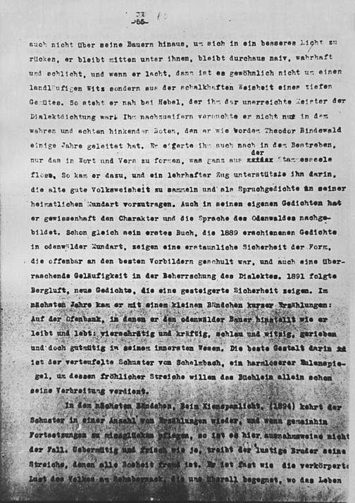 auch nicht über seine Bauern ninaus. un sioh in ein besseres Light zu rülcken, er bleibt mitten unter ihnen, bleibt durchaus naiv, vahrhaft und schlicht, und wann er lacht, dann ist es gevöhnlich nicht un einen landlufigen Vits sondern aus der schalkhaften Aeisheit eines tiefen Gecdtes. So steht er nah bei Hebel, der 1hn der unarreichte keieter der Dialektdichtung var Ihr nachzueifern verimchte er nicht nur in dam vahren und echten hinkender Doten, den ar wie vordean Theodor Bindena 1d einige Jahre geleitet hat. Fr e¹Terte ihn auchn nneh in den Bestreben, nur das in Tort und vers zu fornen, was çanz aus sftdax tan esseele fl1ose, 80 kam er dazu, und ein 1ehrhafter Zug unterstütste Ihn darin, die alte gute volksweisheit zu samneln und als spruohgediohte an seiner hoimatlichen tundart vorzutragen. Auch in soinen eigenen Gedichten nat er gevissenhaft den Charakter und die Sprache des Odenwa14 s naohge- bildet. Schon gleich aein orates Buch, die 1889 oerschtenenen Gedichte in odenwslder sundart, zelgen oine eretaunliche Sioherheit der For. die offenbar an den besten Vorbildern geschult war, und auch eine über- Teschende delkufigkeit in der Beherrschung des Dialektes. 1891 folgte Bergluft, neue Gedichte, 416 elne gesteiger te Sioharhoit ne1Gen. I