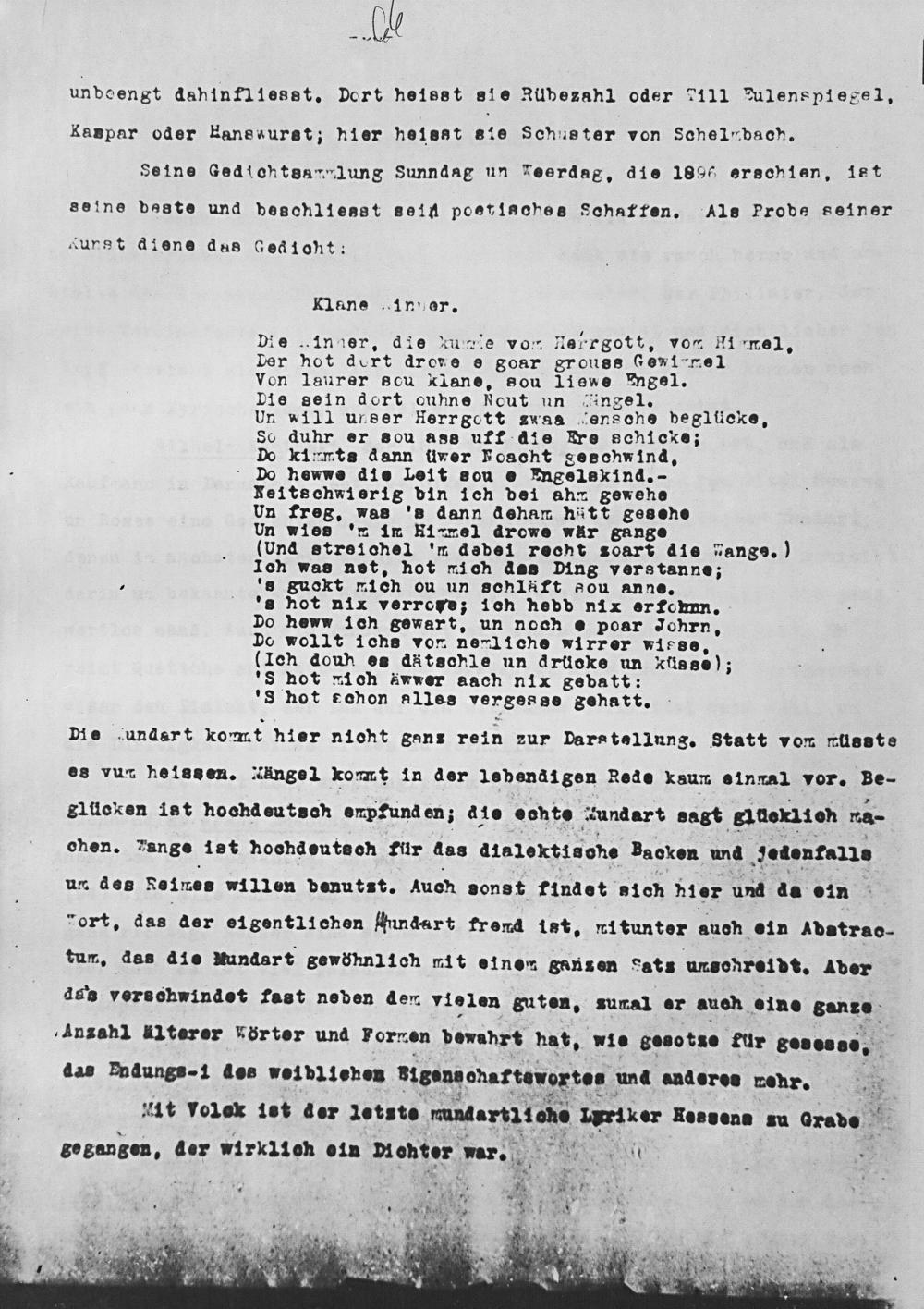 Dbie in er, die aurle vor Helrgott, von Hi mel. Der hot dert irone 86 goar grouss 661 me1 von 1aurer scu klane, sou liewe ngel. Die sein dort ouhne kcut un ungel. Un w 111 unser Herrgott zuaa ensche beglilcke, Soc duhr er sou ase uff die kro schicke; Do kinmtse dann diwer Foacht geschwind, Do heuwe die Leit sou e ngelskind.- Neitschierig bin ich dei ahn gewehe Un freg, was's dann deham hitt gesehe Un vies' in R4 e1 drowe wär gange (und streichel'm debei recht soart die Nange.) Ich was not, hot mich das Ding verstanne; 2 s guckt mich ou un schläft sou anne. s hot nix verroye; 1ch hedb nix erfohnn. Do heuv ich gewart, un noch o poar Johrn, Do vollt 1che von neliche wirrer wHiese, (Ien doun os dätschle un drüoke un kls 8); *„8 hot nich kwwer aach nix gebatt: *8 hot sochnon alles vergense gehatt.