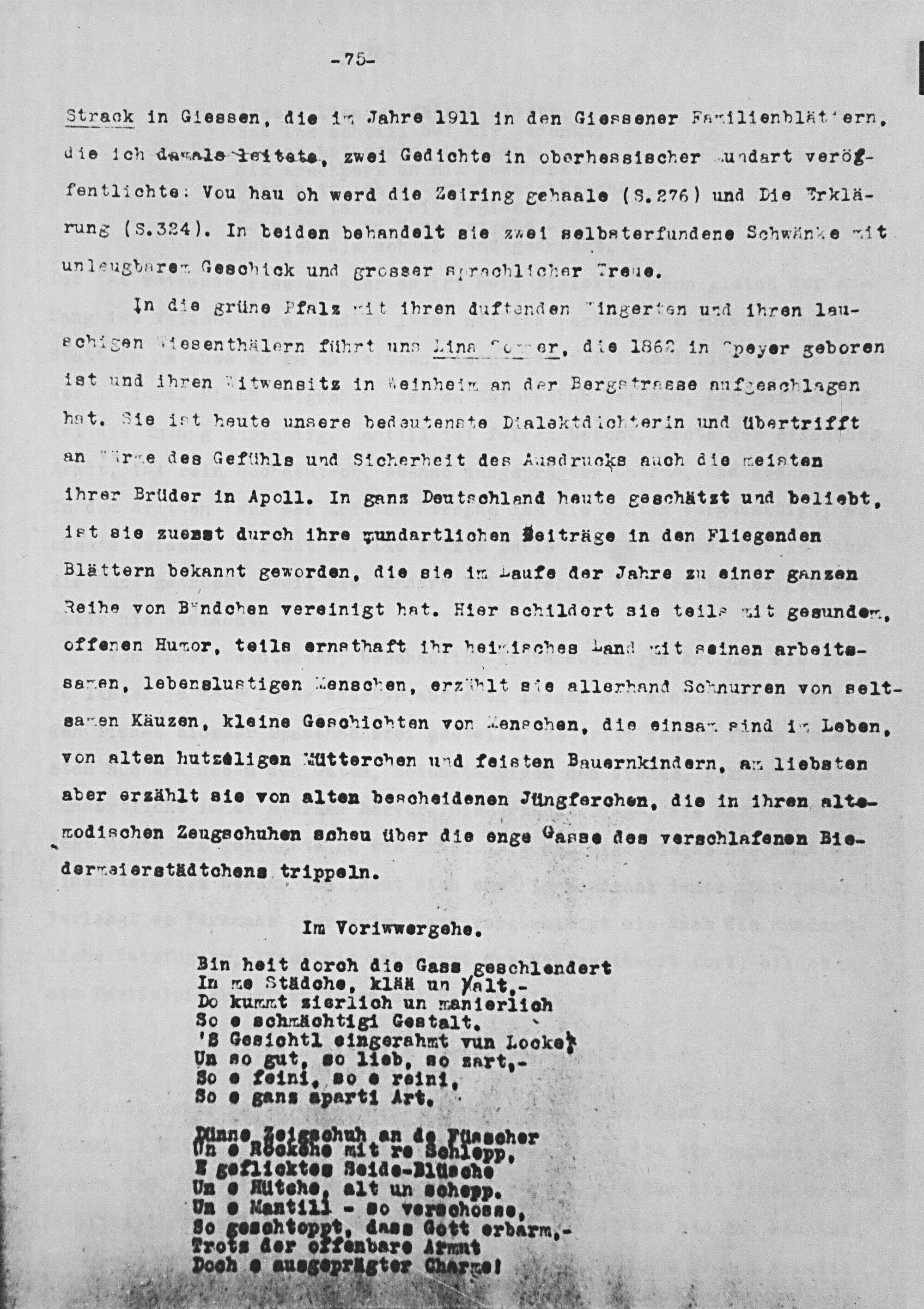 In die grüne Pfalz 1 t 1pren duftenden ingerten und 1hren 1au- schigen„tesenthälern filhrt und Lina Wo er, dle 1867 in Speyer geboren ist und ihnren Sitwensitz in einneln an der Bergetrasse nufbeschlagen nat. Zie int heute unsere bedautenote Dialektd ioh verin und lbertrifft an irme des Gefiihls und Sicherheit des Ausdrucks auch die neinsten ihrer Brüder in Apol1. In ganz Deutschland heaute geschätst und beliebt, ist 8sie zuenst durch ihre gundartlichen Seiträge in den FIiegenden Blättern bekannt geworden, die sie in Laufe der Jahre zu einer ganzen Seihe von Bendchen vereinigt hat. Hier schildort sie teils nit gesunden, offenen Huuor, tellse ernsthaft i1hr heiisches Land ait seinen arbeita- sanen, lebenslus tigen enschen, erzhlt Sie allerhand Schnurren von selt- sanen Käuzen, kleine Gesohichten von Lenschen, die einsan sind 1- Leben, von alten hutreligen autterchen und feisten Bauernkindern, an liebsten aber ersählt sie von alten peschetdenen Jüungferohen, die in ihren alte- wodischen Zenssohuhen scheu dber die onge Oasse des verschlafenoen B1 e-