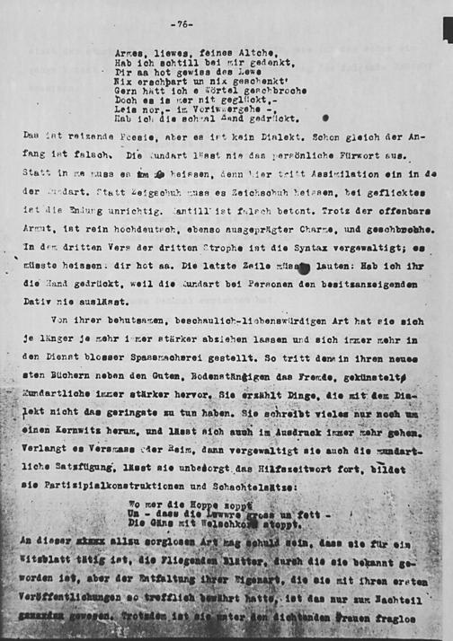 Hlab ich die scheal dand gedriiockt. 4 Das i8t retzende Poesie, aber es itt kein Dialekt, Schon gleich der An- fang ist falson, Die zundart lset nie das ersönliche Fürwort sus. Statt in na nuss 6s m 0 heissen, denn Lier tai“t Assisilation oin in 4 der dart. tatt geige chun zuss es Zeichsohuhn heissen, bei geflicktes ist die ndung unrichtig. antill ist falsch betent. Trotz der offenbare K5rnut, ist rein hochdeutech, ebenso ausgeprägter Charze, und geschbpobho. In dem dritten Vers der dritten Strophe iat die syntax vergevaltigt;. lisste neissen: dir hot aa. Die 1atzte 2a11 a lauten: Hab ich ihr die dand gedriülckt, weil die dundart bei Personen den besitsanzeigenden Dativ nie auslässt.