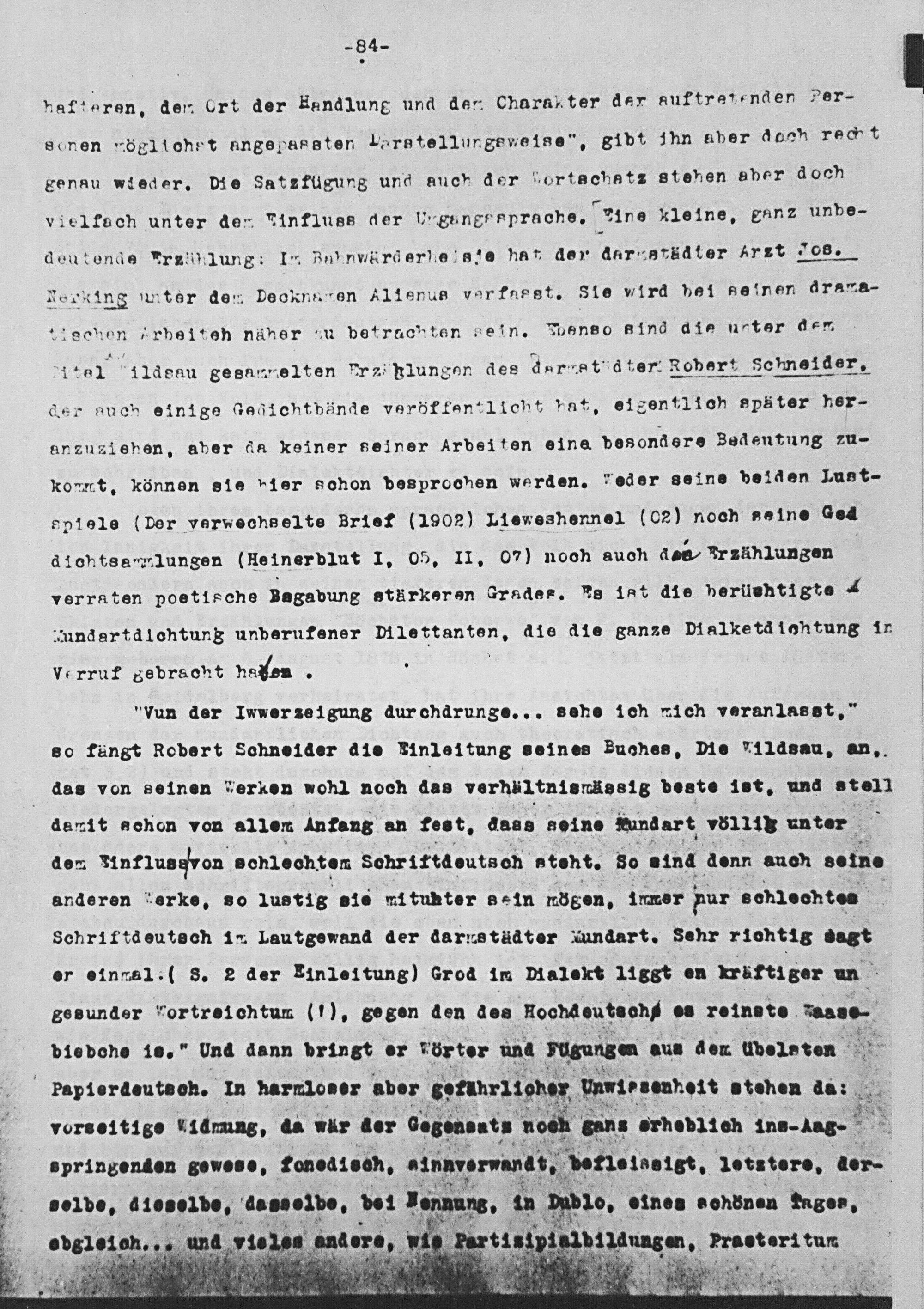 „Vun der Iwwerzeigung dur chdrunge. sehe ich nich veranlasst.“ so fungt Robert Schneider die Tinleitung seines Buches, Die i1dsau, an, das von seinen Verkon vohl noch das verhältnisnbieeis beste iet, und 2*°11 amit schon von allem Anfang an rest. daas soine mundart v5llik untar den Sinflusvon ,ohlochtom Sohriftdoutsoh„tont. 80 aina denn auch ,1. anderen erke, so lustig 81° mituhter sein nögen. inmer nur 2ehleehtes schriftdeutech in Lautgewand der darustädter zundart. Sehr riehtig 4ast or oings 1.(8. 2 der Einleitung) Grod im Dialekt ligst en Eftigar un 3