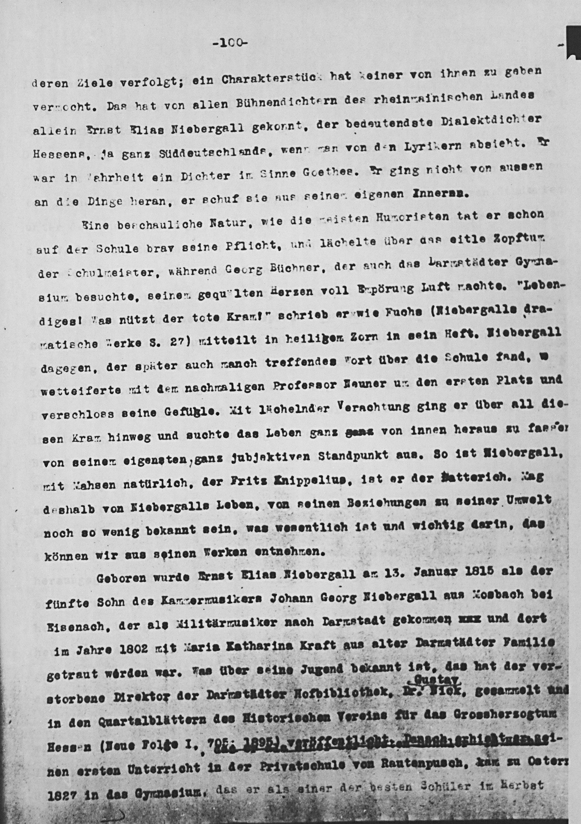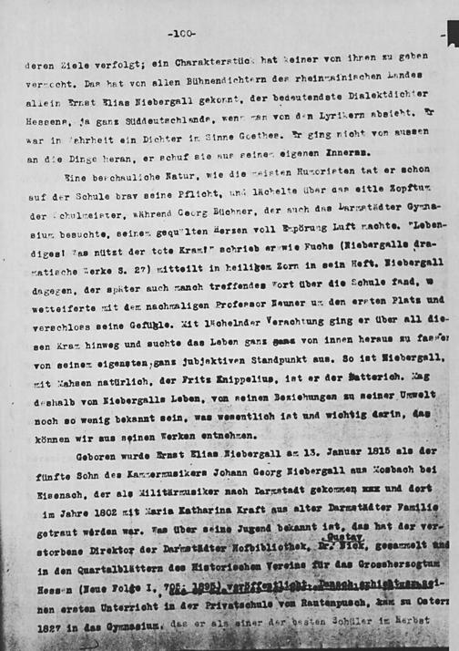 deren 21 le verfolgt; ein Charakters tüc- hnat einer von ihnen zu goben verncehnt. Das hat von allen Bühnend ichtern des rhein ainischen Lundes al lein Urnst Klias Hiebergal1 gekonnt, der dedeutendste Dialektdichter Heseens, za ganz Slddeutechlande, ven, en von den Lyrikern abeitenht. aar in ehrheit ein Dichter in Sinne Goethee. ur ging nicht von aunssen an die Dinge heran, er schuf ste nus Seiner eigenen Innernn.