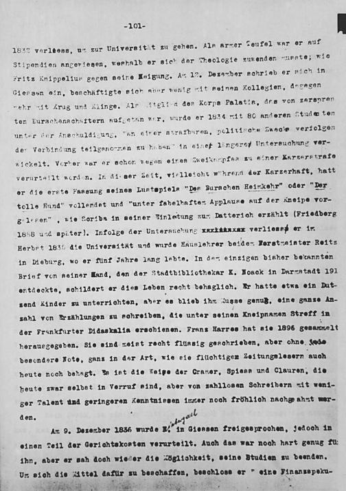 1832 verltess, un zur Universitst zu Sehen. A1s arner 7eufel war er auf stipendien angeviesen, weshalb er sie'* der Theologie zuwenden usste; Eie rritz Knippelius gegen seine eigung. A 12. Dezenber schrieb er aiecn in Giessen ein, deschäftigte siecn aber venig uit seinen Kollegien, dogesen enr it KArug und KAlinge. 18 itgli a des Korps Palatla, dus von z2618DTG! ten Ekurschens chaftern aufgetan ver, wurde er 1834 1t 80 anderen tude ten unter der eneschuldiguns, an einer Svrarbaren, PClitische 2u6& verfolgen der Verbindung teilgenorren zu fban in einef 1nger-7 Untersuchung ver- „1 ckelt. Vorber var er schon vesen eir es Wweiktnpfes zu einer Karzers rafe verurtei 1t vcrden. In di. ser zeit, vi- 11eicht whrend der Karzerhaft, hatt or die erste Fassung seines Lustepiels Pos Burs chen Heinkehr“ oder Per t011° Hund“ vollendet und'unter fabelhaften Applause auf der Rnelpe vor- g lesen“„ vie Soriba in seiner ginlettung zur Datterioch erzählt(Friedberg 1858 und spéter). Infolge der Untersuchung IXxIAANXRE verlieseß er ir. Herbet 1830 die Universität und wurde Hauslehrer deiden Ierstneister Reitz in MHeburg, wo er fünf Jahre lang lebte. In den einzigen bisher dexannten Brief von seiner Hand, don der Stadtbibliothekar K. Joack in Darsstadt 191 entdeckte, schildert er dies Leben recht dehnaglich. Er hatte otwa ein Dut- send Kinder zu unterri chten, aber es blieb ihm 4ue2s genuß. oine ganze An- zahl von Erzählungen zu schreiben, die unter seinen Knoipnamen Streff in der Frankfurter Didas kalia ersochienen. Franz Harree hat 81° 1896 gosammelt nerausgegeben. Sie sind geist recht flüssig gesohrieben, aber chne 40 vesondere Jote, Sans in der Art, wie sie flichtigen Zzei tungslesern auoh heute noch behagt. ist die Feipe der Craner, Spiess und Clauren, die heute zwar gelbet in Verruf aind, aber von szahllosen Schreibern it weni- ger Talent und geringeren Kanntniesen inwer noch fröhnlion nachg ahnt wer-