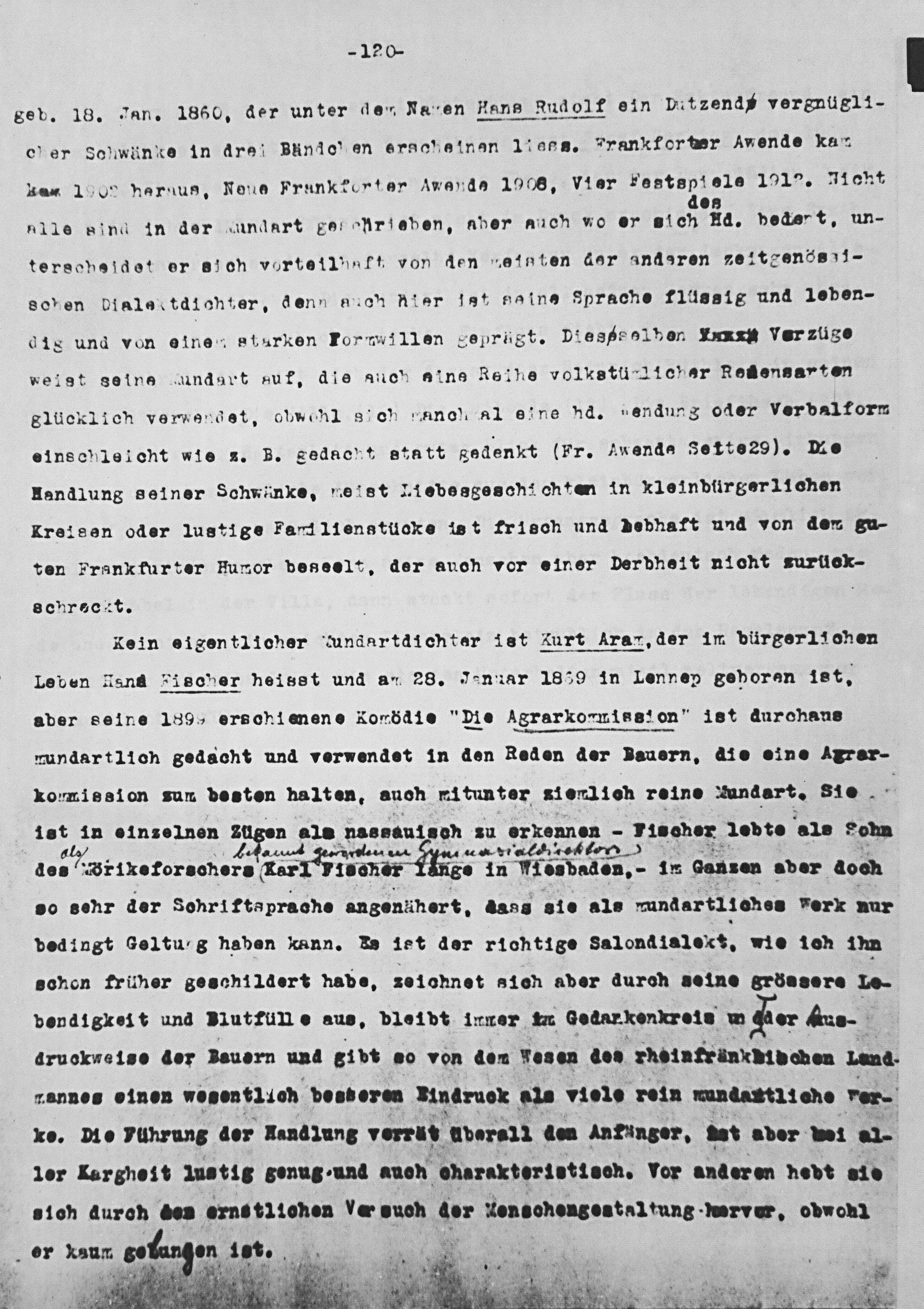 geb. 18. Jan. 1860, der unter den Naren Hans Rudolf ein Ditzendß versnügl 1- o er Sohwänte in dre Bündo' en erscheinan 11ds. vrankfor ber Awende kan kar 1 90 Naraus, Reue Frunkferter Awe ⁴da 1906, Vier Festsplele 1010. Jicht nYle sinda in der uindart getehrſeben, aber auch wo er„le8 Ba. dede t, un- terscheidet er elch vorteil“ft, von den welhRten deor andoeren zeltgenss1- scwen biale tdiochter, denn auch hier 1st Haine Sprache flllssig und 1eben- d1s und von aina. aburken Tormil1en gepräst. Diesdte elben Iasg Vor zlige weist seine aundart suf, die aulch alne Relhe volkstü licher Redensaten glücklich verwendet, obvChl s ch inoh al eine nd. vendung oder Verbalforn „inschleicht wie z. B. gedacht statt gedenkt(Fr. 4wende Setto 29). Me Handlung seiner Schwinke,"eiet Eiebesgeschi chten in kleinbürgerlichen Kreisen oder lustige Faud lienstücke 1e t frisch und Ddebhaft und von dem gu- ten Frankfurter Huncr beseelt, der auch vor einer Derbheit nicht zurdick- schrecit.
