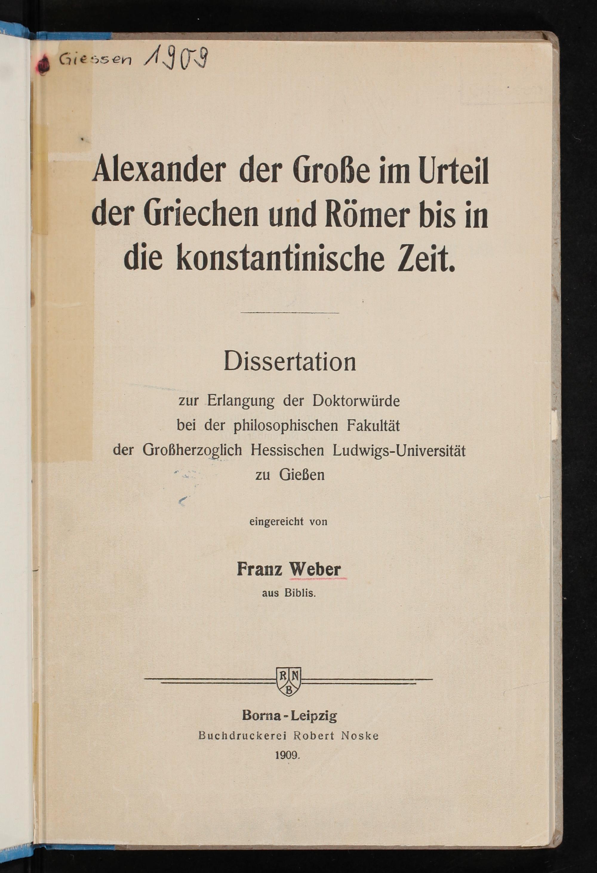 Alexander der Große im Urteil der Griechen und Römer bis in die konstantinische Zeit / eingereicht von Franz Weber