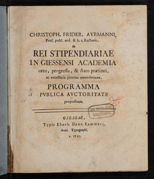 De rei stipendiariae in Giessensi Academia ortu, progressu, & statu præsenti, ac necessaria prorsus emendatione, Programma pvblica avctoriatate propositum. / Christoph. Frider. Ayrmanni, Prof. publ. ord. & h.t. Rectoris