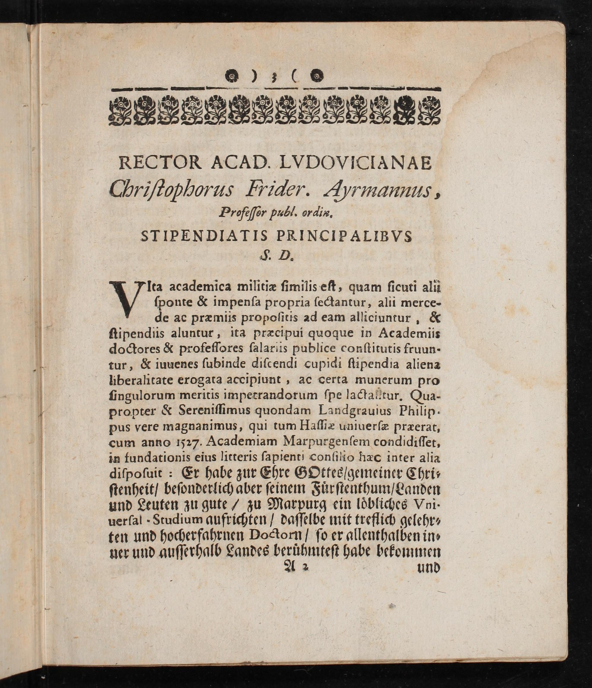 De rei stipendiariae in Giessensi Academia ortu, progressu, & statu præsenti, ac necessaria prorsus emendatione, Programma pvblica avctoriatate propositum. / Christoph. Frider. Ayrmanni, Prof. publ. ord. & h.t. Rectoris
