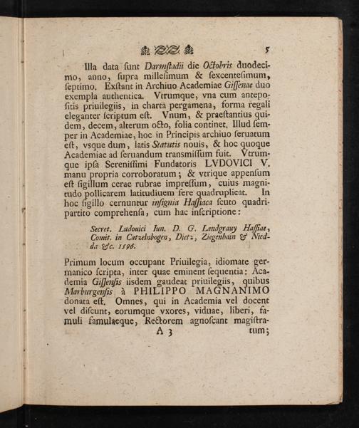 Academiae Lvdovicianae Rector Lvdov. Godofr. Mogen Doctor ivridicvs et Professor Historicvs , de Statvtis Antiqvis Academiae Gissenae Pavca Praelibat, Ex Iisqve Excerpta Exhibet, et ad Pvblicam Pro Restitvta Pace Deo Referendam Gratiam Avdiendamqve Orationem de Statvtis Academiae Gissenae Hodiernis a se Habendam Solemnemqve Legvm Academicarvm Praelectionem qvae Vno Eodemqve Actv Ipsis Calendis Ivlii B.C.D. Institventvr, Academiae Proceres, Literatvmqve Favtores Qvoslibet, Item Omnivm Facvltatvm Stvdiosos Generosissimos et Nobilissimos ea, Qva Decet, Observantia Atqve Hvmanitate Invitat. Pvblicatvm Dom. IV. Post Festvm Trinitati Sacrvm, Anno MDCCLXIII. Sub Sigillo Academiae Maiori. / Ludov. Godofr. Mogen