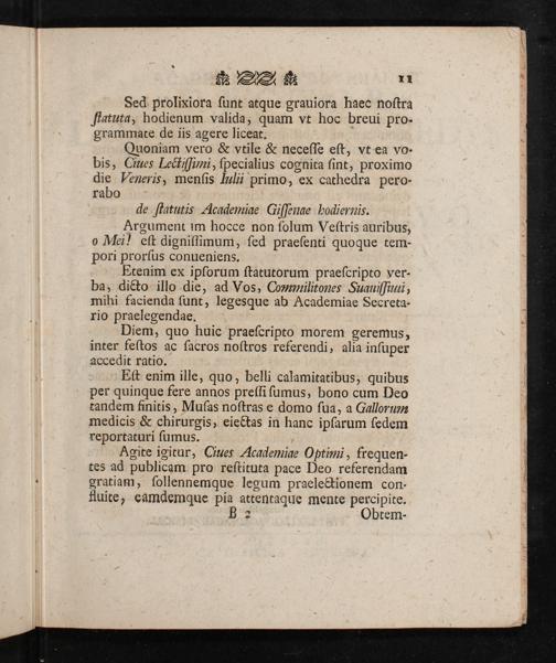 Academiae Lvdovicianae Rector Lvdov. Godofr. Mogen Doctor ivridicvs et Professor Historicvs , de Statvtis Antiqvis Academiae Gissenae Pavca Praelibat, Ex Iisqve Excerpta Exhibet, et ad Pvblicam Pro Restitvta Pace Deo Referendam Gratiam Avdiendamqve Orationem de Statvtis Academiae Gissenae Hodiernis a se Habendam Solemnemqve Legvm Academicarvm Praelectionem qvae Vno Eodemqve Actv Ipsis Calendis Ivlii B.C.D. Institventvr, Academiae Proceres, Literatvmqve Favtores Qvoslibet, Item Omnivm Facvltatvm Stvdiosos Generosissimos et Nobilissimos ea, Qva Decet, Observantia Atqve Hvmanitate Invitat. Pvblicatvm Dom. IV. Post Festvm Trinitati Sacrvm, Anno MDCCLXIII. Sub Sigillo Academiae Maiori. / Ludov. Godofr. Mogen