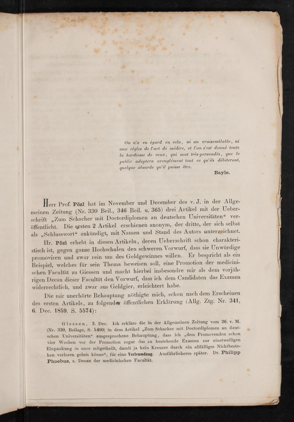 Abwehr von Schmähungen, welche Herr Dr. Joseph Pözl, o.ö. Professor f. Bayerisches Staatsrecht a.d. Köln. Bayerischen Ludwig-Maximilians-Univ. zu München, wegen einer 1859 zu Giessen vollzogenen medicinischen Promotion gegen mich gerichtet hat / von Dr. Philipp Phoebus, o.ö. Prof. d. Med. a.d. Grossherzogl. Hess. Ludewigs-Univ.
