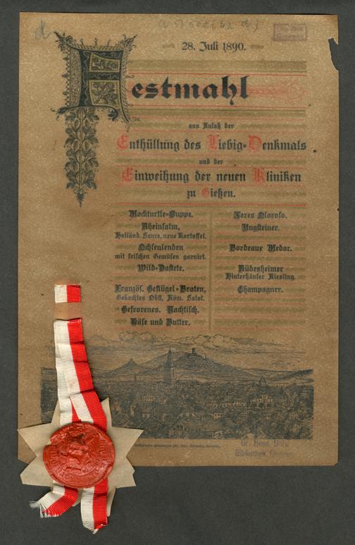 Festmahl aus Anlaß der Enthüllung des Liebig-Denkmals und der Einweihung der neuen Kliniken zu Gießen : [Speisenkarte] / [Stadt Gießen]