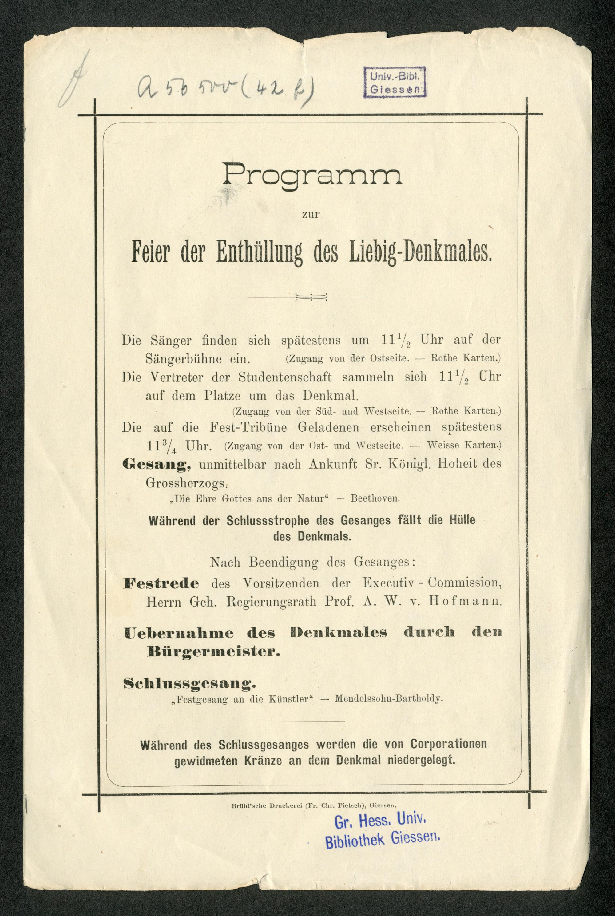 Programm zur Feier der Enthüllung des Liebig-Denkmales / [Stadt Gießen]