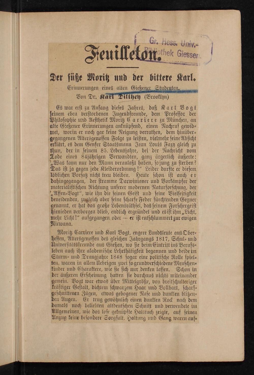 Der süße Moritz und der bittere Karl : Erinnerungen eines alten Gießener Studenten / von Dr. Karl Dilthey