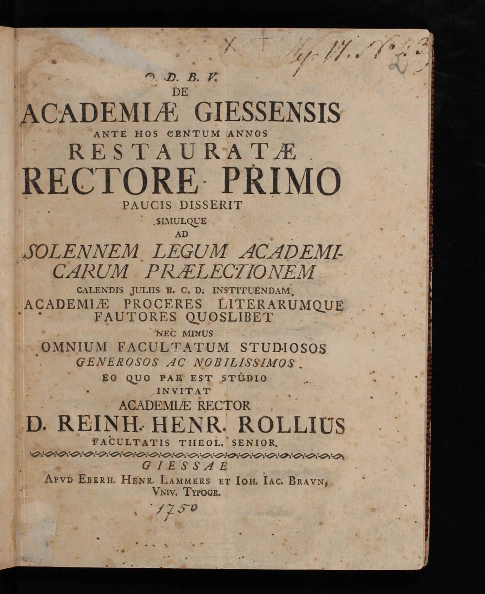 Q.D.B.V. De Academiae Giessenis Ante Hos Centum Annos Restauratæ Rectore Primo Paucis Disserit Simulque Ad Sonennem Legum Academicarum Prælectionem Calendis Juliis B. C. D. Instituendam Academiæ Proceres Literarumque Fautores Quoslibet Nec Minus Omnium Facultatem Studiosis Generosos Ac Nobilissimos / Eo Quo Par Est Studio Invitat Academiæ Rector D. Reinh. Henr. Rollius Facultatis Theol. Senior.