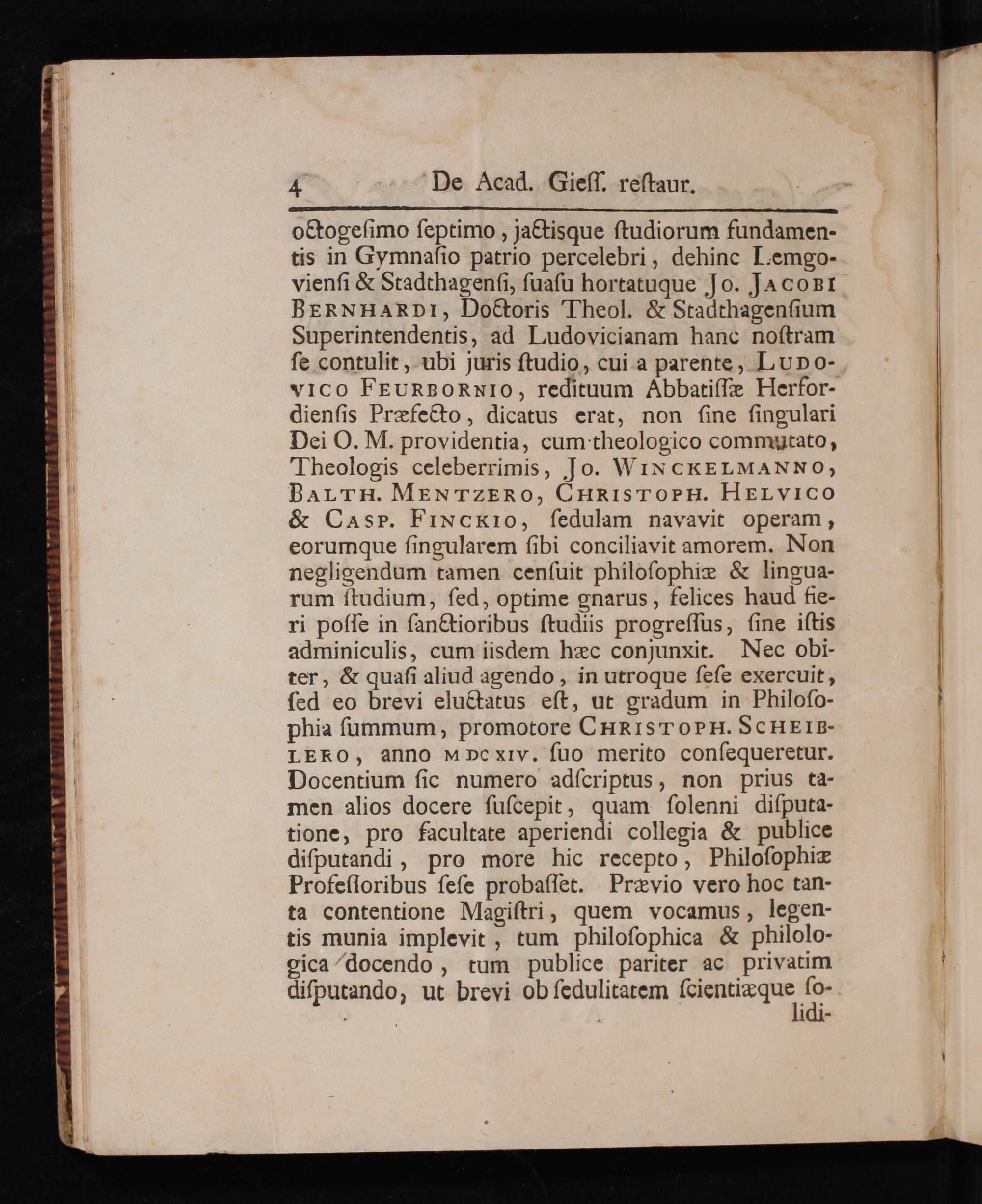 Q.D.B.V. De Academiae Giessenis Ante Hos Centum Annos Restauratæ Rectore Primo Paucis Disserit Simulque Ad Sonennem Legum Academicarum Prælectionem Calendis Juliis B. C. D. Instituendam Academiæ Proceres Literarumque Fautores Quoslibet Nec Minus Omnium Facultatem Studiosis Generosos Ac Nobilissimos / Eo Quo Par Est Studio Invitat Academiæ Rector D. Reinh. Henr. Rollius Facultatis Theol. Senior.