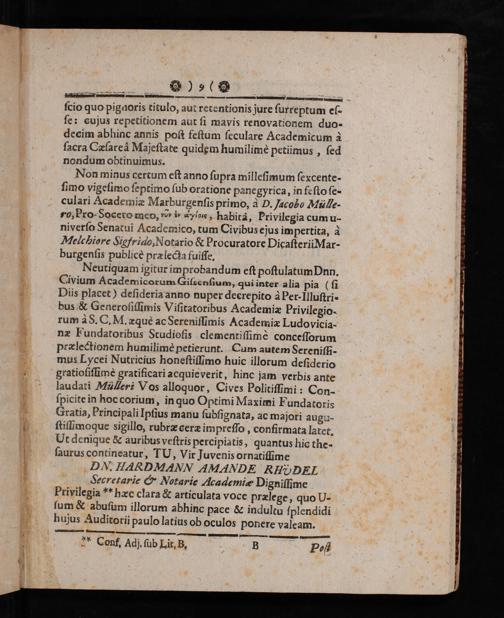 Privilegia Studiosorum Gissensium Sub Anniversaria Legum Prælectione Publice Repetita Et Oratione Panegyrica De Usu Et Abusu Privilegiorum / Fusius Explicata A Mich. Bernhardo Valentini, Archiatro Hasso-Darmstadino, Prof. Med. & Philos., Experim. Ordin. ac Rei Oeconomicæ Inspectore