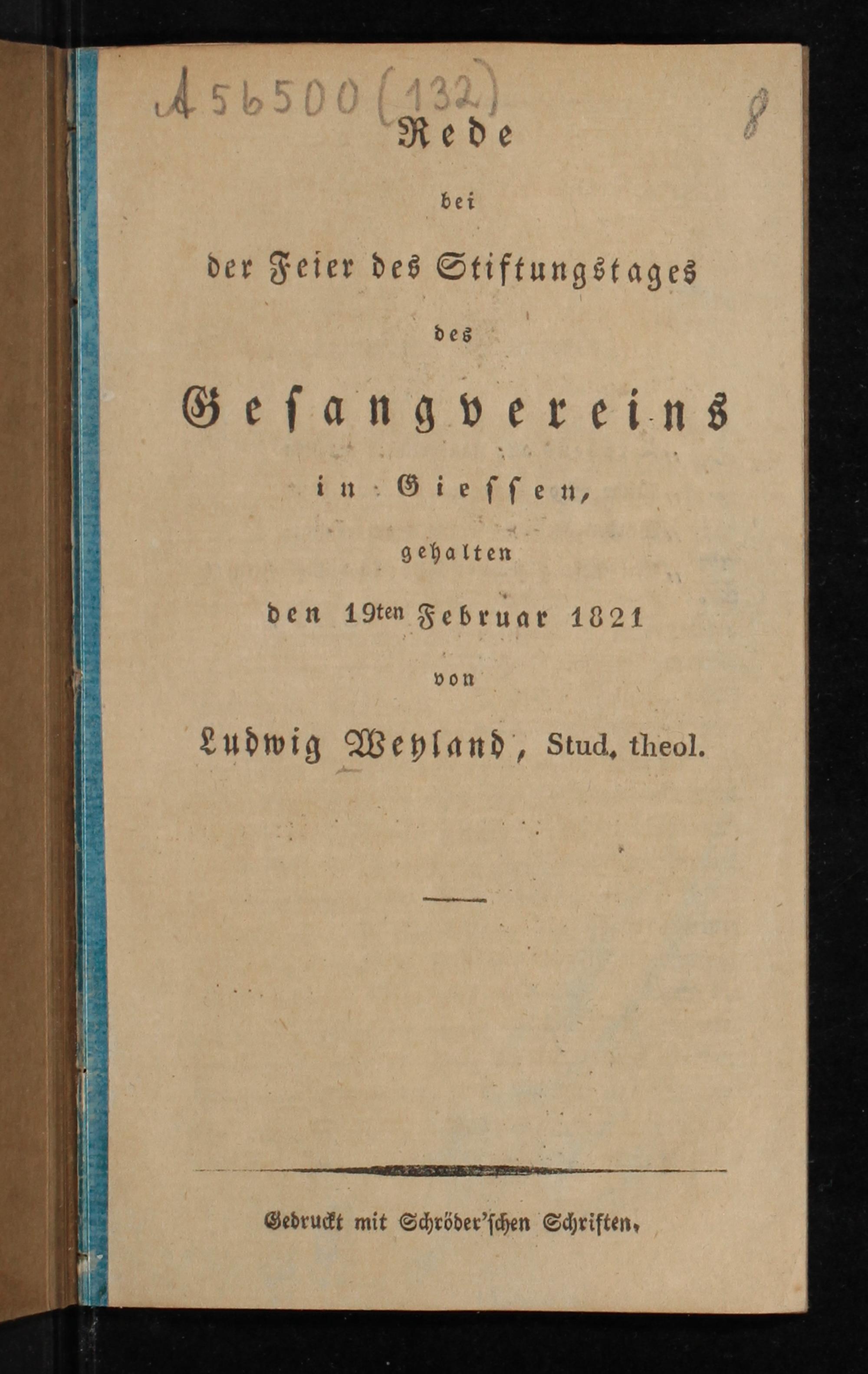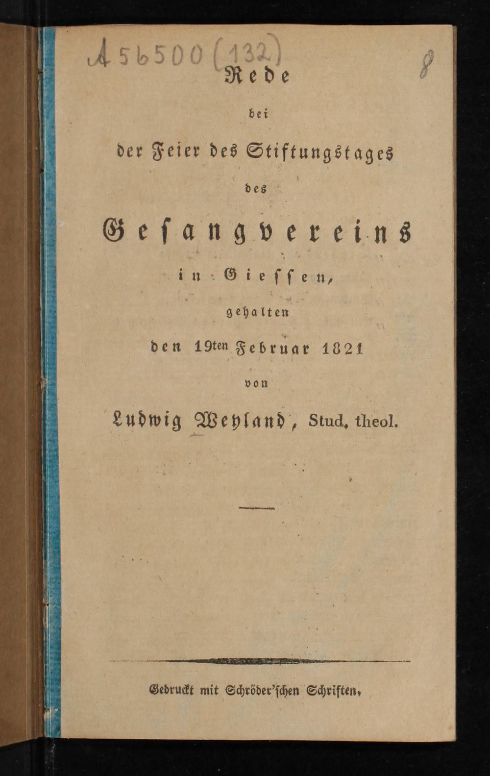 Rede bei der Feier des Stiftungstages des Gesangvereins in Giessen : gehalten den 19ten Februar 1821 / von Ludwig Weyland, Stud. theol.