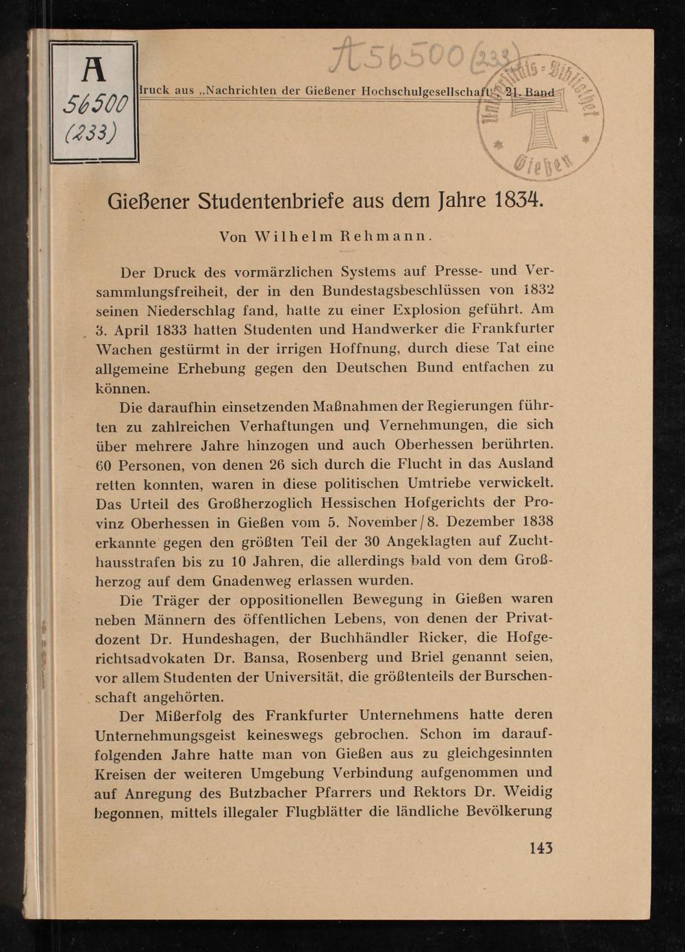 Gießener Studentenbriefe aus dem Jahre 1834 / von Wilhelm Rehmann
