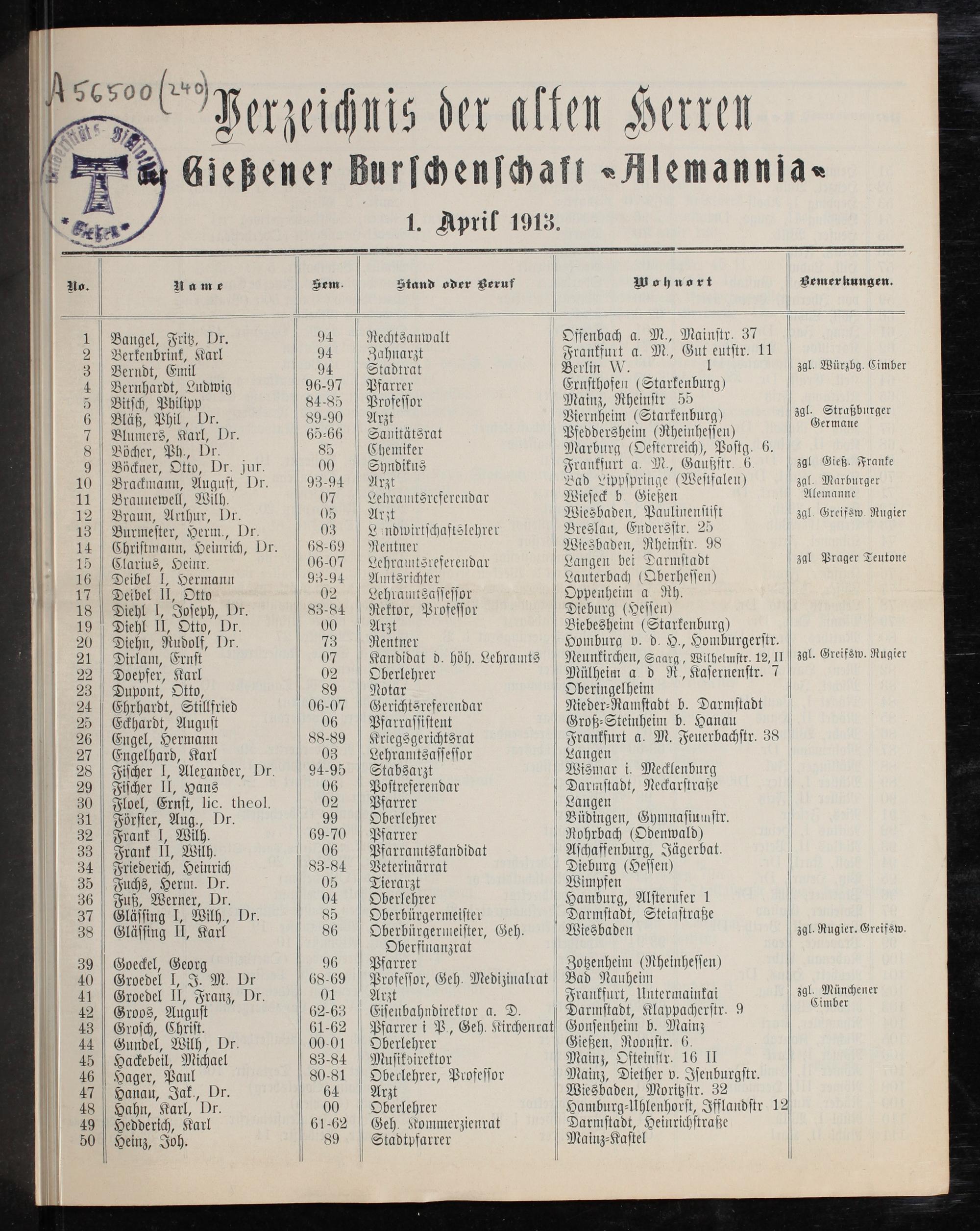 Verzeichnis der alten Herren der Gießener Burschenschaft "Alemannia" : 1. April 1913 / [Altherrenvereinigung Alemannia Gießen]