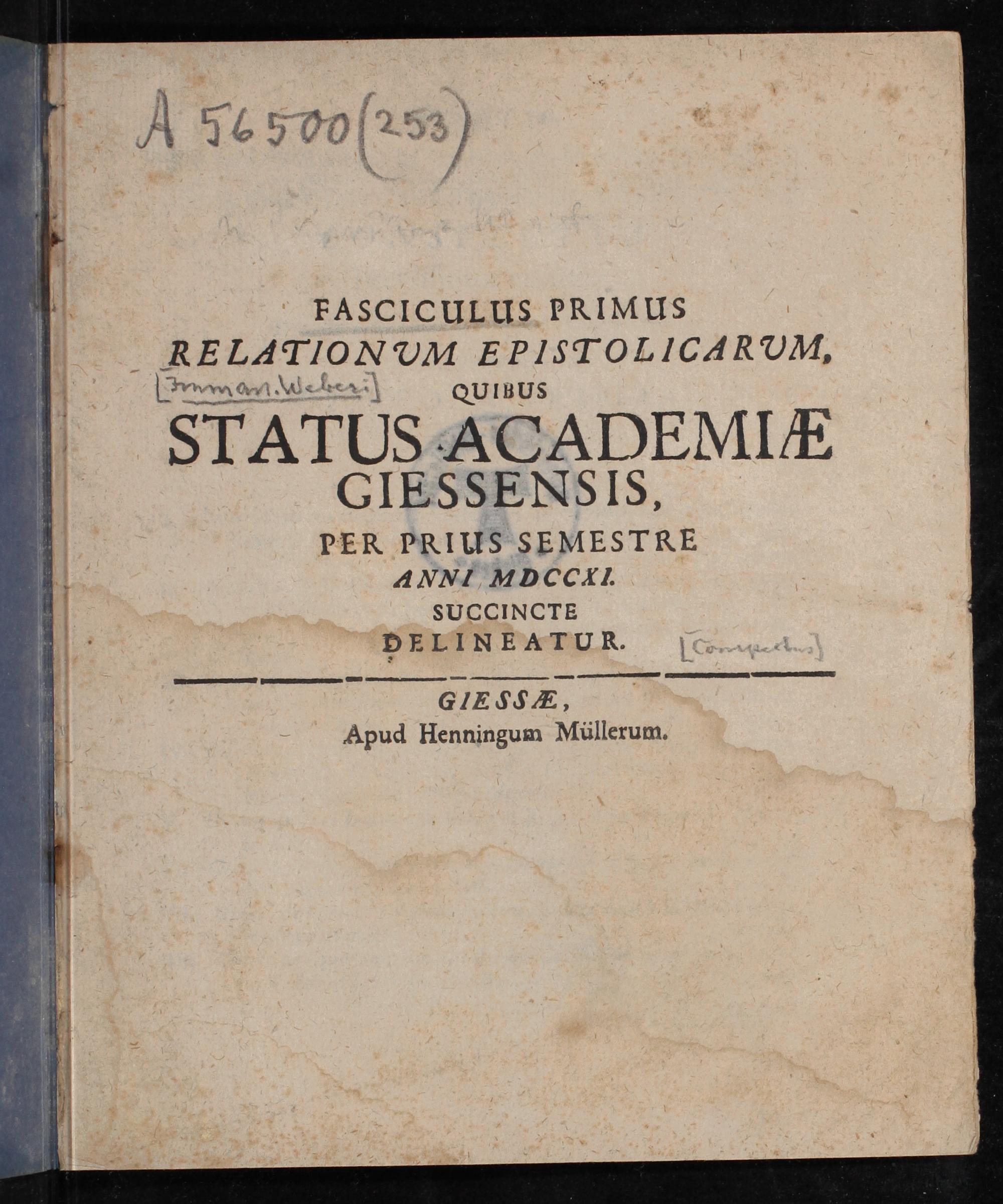 Fasciculus Primus Relationum Epistolicarum Quibus Status Academiae Giessensis, Per Prius Aemestre Anni MDCCXI : Succinte Delineatur / [Immanuel Weber]