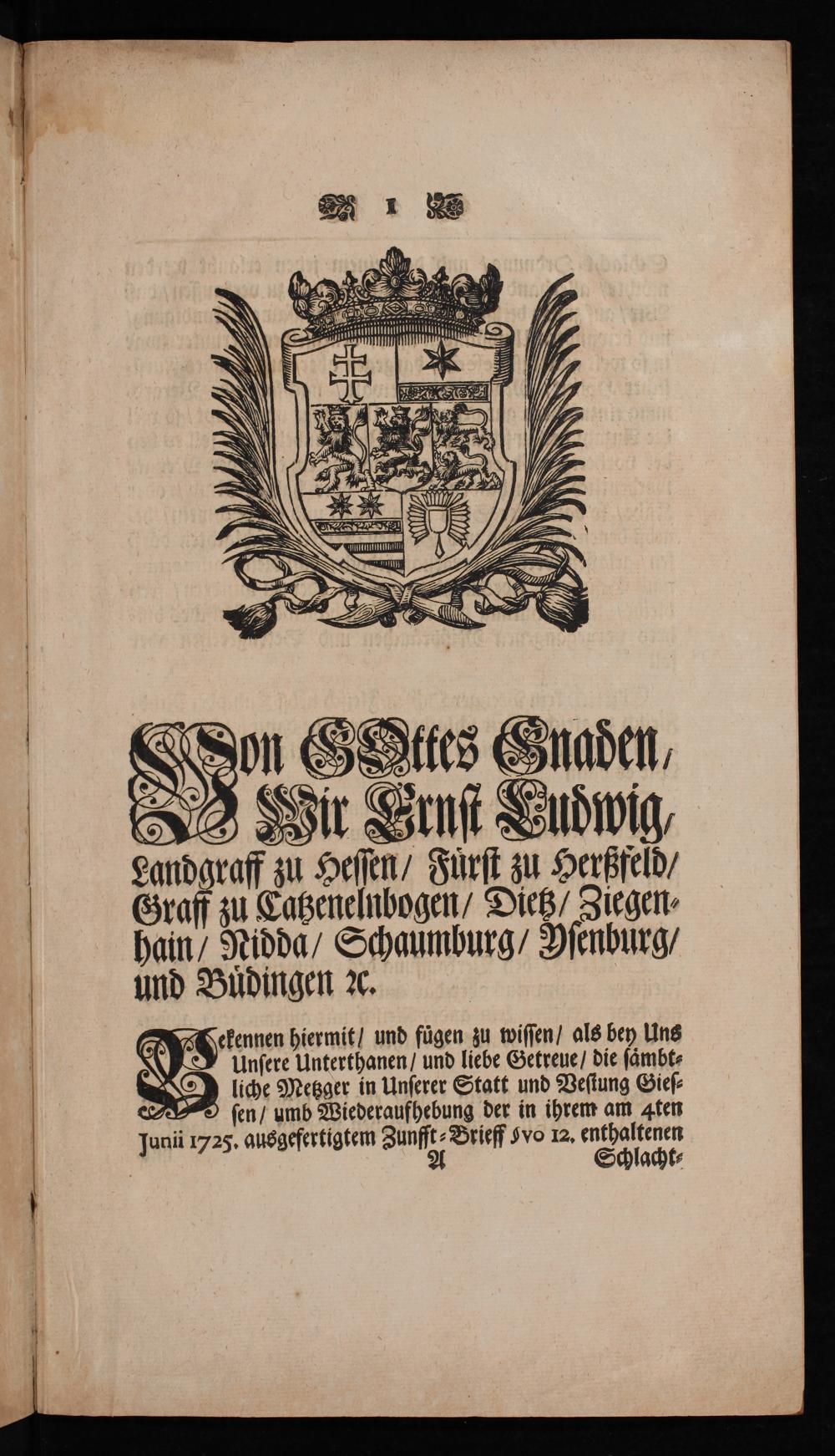 Modification und Erläuterung §.12mi Des von Uns von Gottes Gnaden, Ernst Ludwig, Landgraf zu Hessen, Fürst zu Hersfeld, Graff zu Catzenelnbogen, Dietz, Ziegenhain, Nidda, Schaumburg, Ofenburg und Büdingen [et]c. Unserer Metzger-Zunfft zu Giessen gnädigst ertheilten neuen Zunfft-Brieffs de dato Darmstatt den 4ten Junii 1725 : Mit Gnädigster Verordnung, wie hinkünfftig denen eingeschlichenen, oder weiters einreissenden Mißbräuchen remediret werden solle