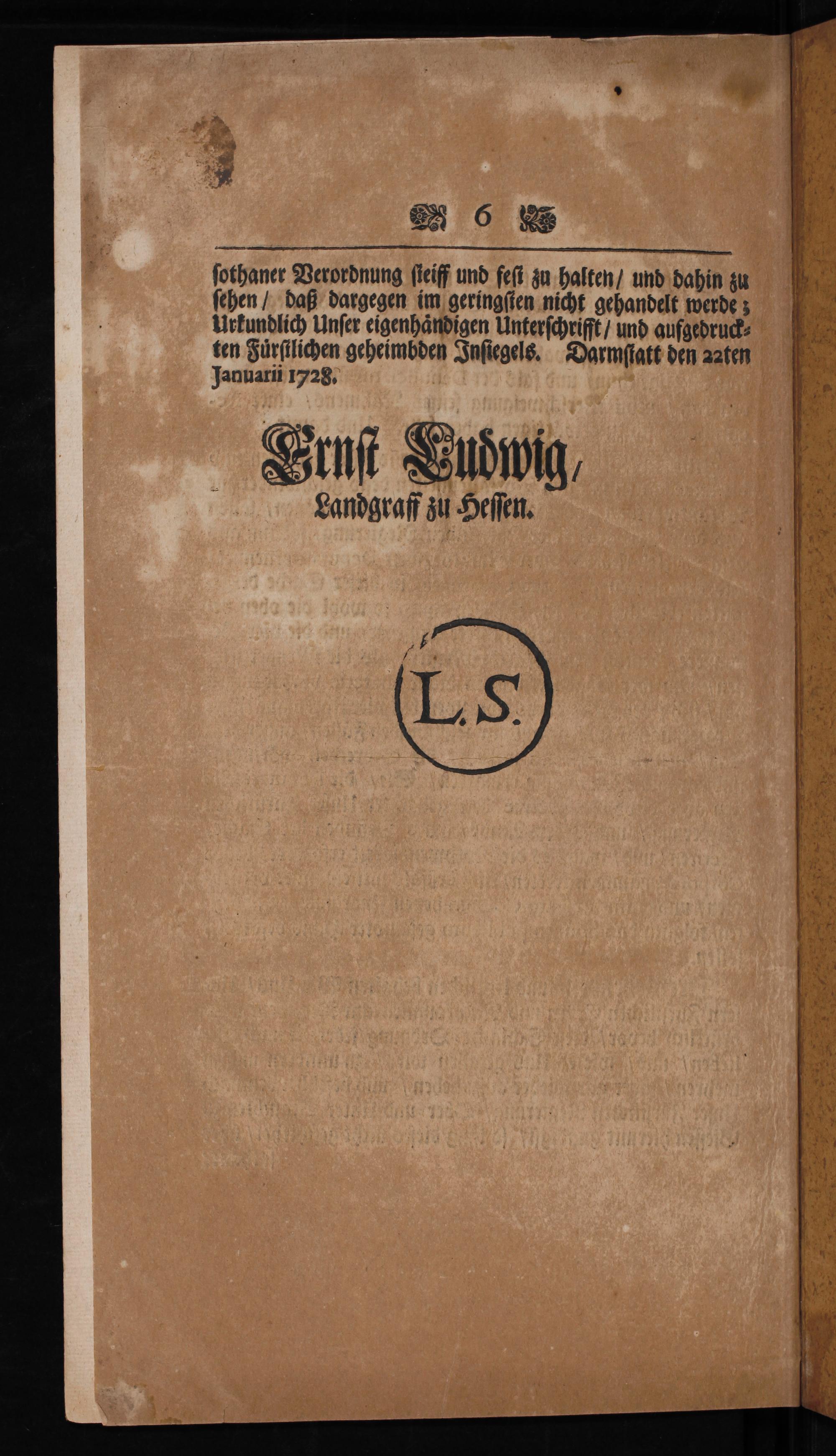 Modification und Erläuterung §.12mi Des von Uns von Gottes Gnaden, Ernst Ludwig, Landgraf zu Hessen, Fürst zu Hersfeld, Graff zu Catzenelnbogen, Dietz, Ziegenhain, Nidda, Schaumburg, Ofenburg und Büdingen [et]c. Unserer Metzger-Zunfft zu Giessen gnädigst ertheilten neuen Zunfft-Brieffs de dato Darmstatt den 4ten Junii 1725 : Mit Gnädigster Verordnung, wie hinkünfftig denen eingeschlichenen, oder weiters einreissenden Mißbräuchen remediret werden solle