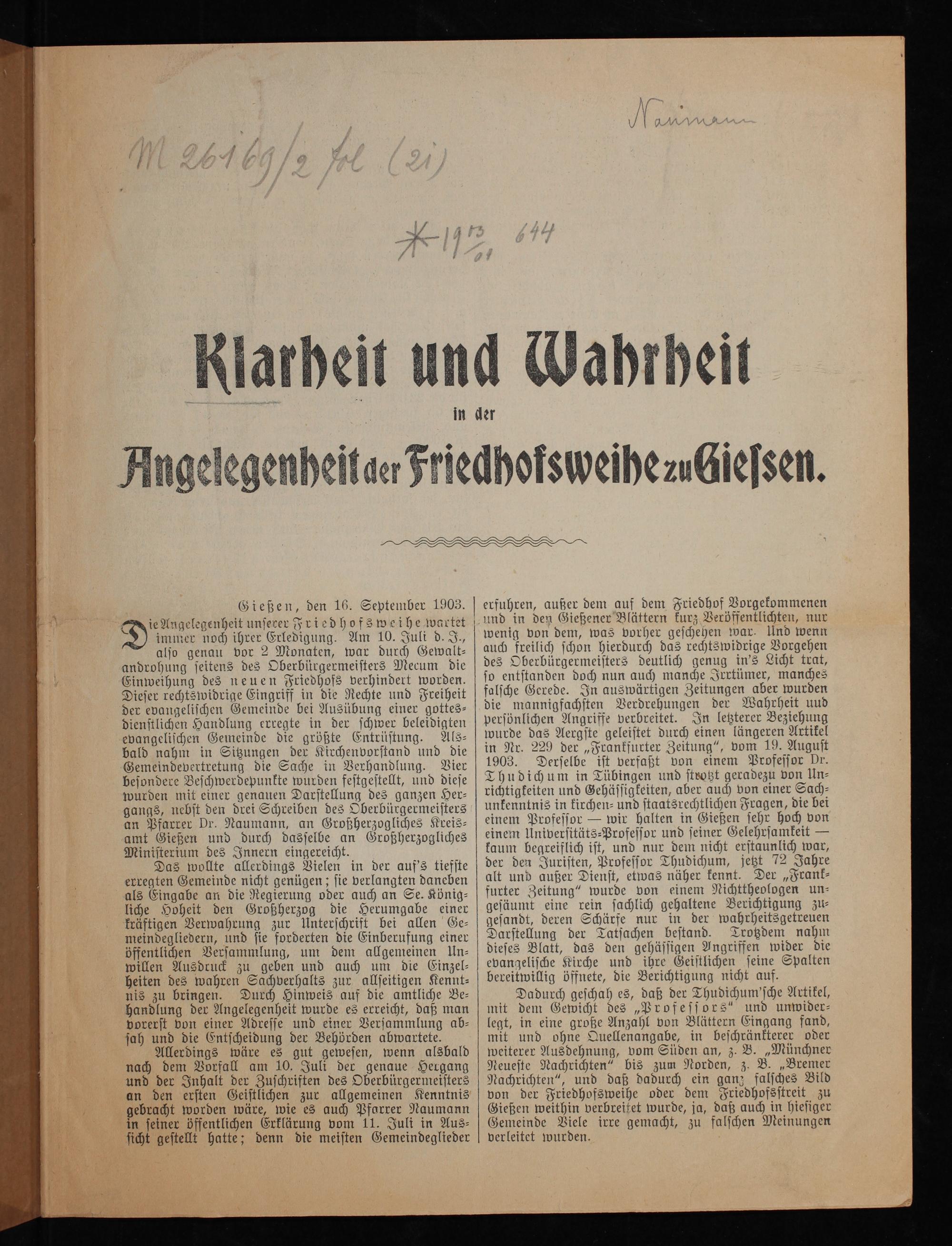 Klarheit und Wahrheit in der Angelegenheit der Friedhofsweihe zu Giessen / [von Karl Naumann]