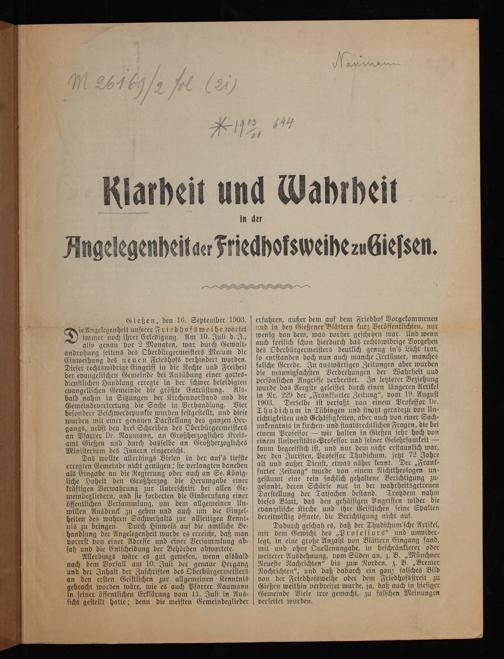 Klarheit und Wahrheit in der Angelegenheit der Friedhofsweihe zu Giessen