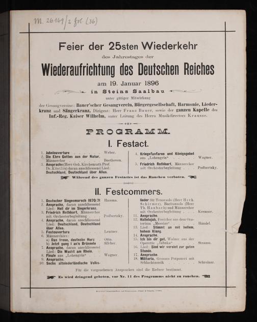Feier der 25sten Wiederkehr des Jahrestages der Wiederaufrichtung der Deutschen Reiches am 19. Januar 1896 in Steins Saalbau : unter gütiger Mitwirkung der Gesangvereine Bauer'scher Gesangvereins, Bürgergesellschaft, Harmonie, Liederkranz und Sängerkranz, Dirigent: Herr Franz Bauer, sowie der ganzen Kapelle des Inf.-Reg. Kaiser Wilhelm, unter Leitung des Herrn Musikdirectors Krausse
