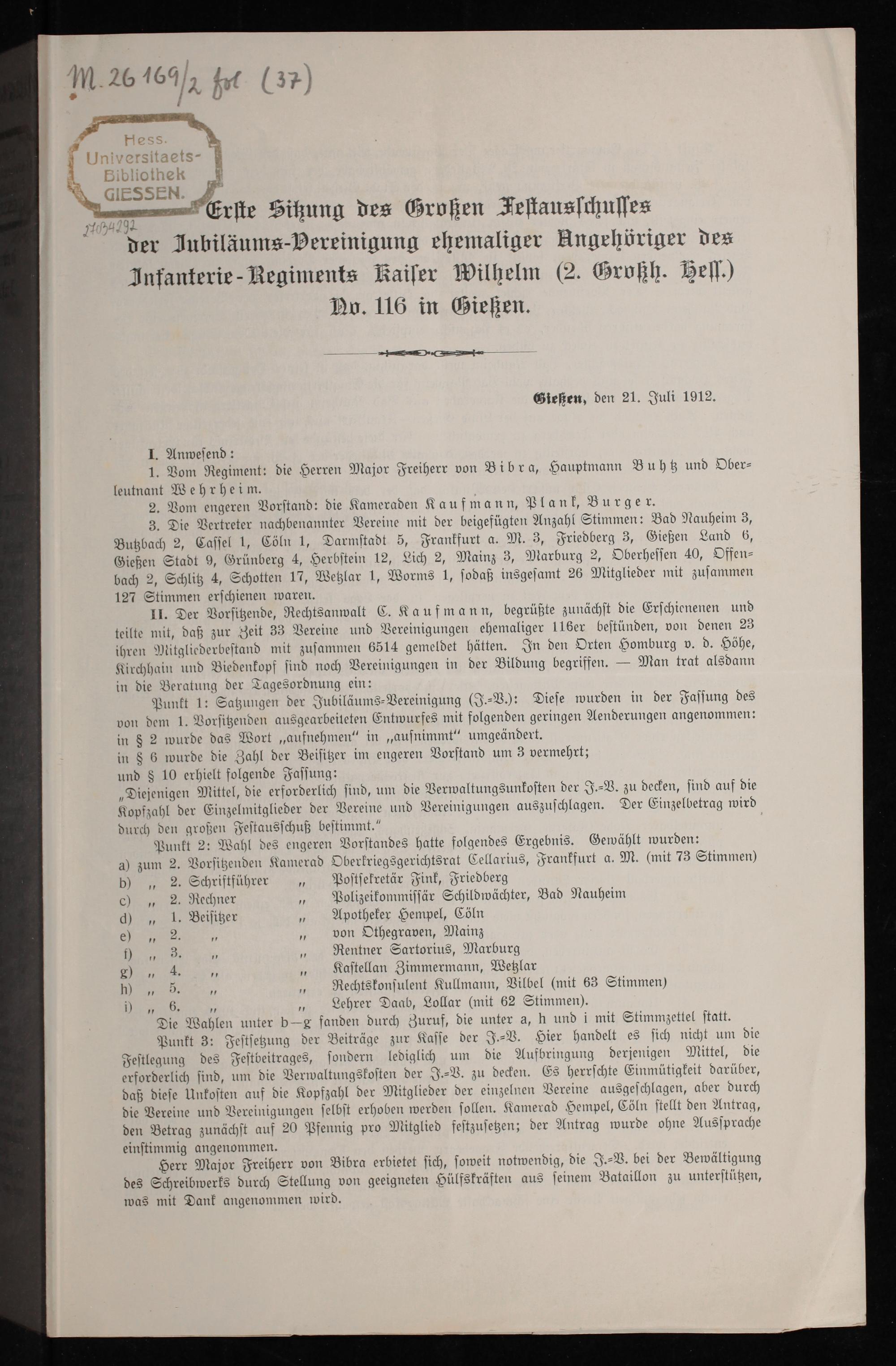Erste Sitzung des Großen Festausschusses der Jubiläums-Vereinigung ehemaliger Angehöriger des Infantrie-Regiments Kaiser Wilhelm (2. Großh. Hess.) No. 116 in Gießen / Zur Beglaubigung: der 1. Vorsitzende: Curt Kaufmann, der 1. Schriftführer: Carl Plank