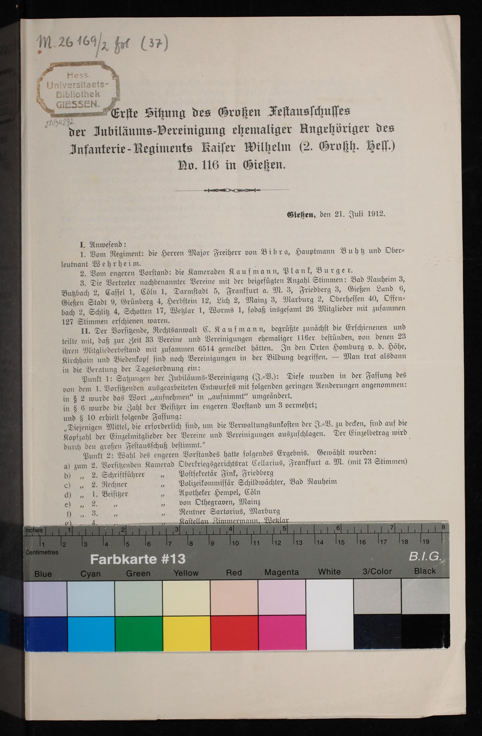 Erste Sitzung des Großen Festausschusses der Jubiläums-Vereinigung ehemaliger Angehöriger des Infantrie-Regiments Kaiser Wilhelm (2. Großh. Hess.) No. 116 in Gießen / Zur Beglaubigung: der 1. Vorsitzende: Curt Kaufmann, der 1. Schriftführer: Carl Plank