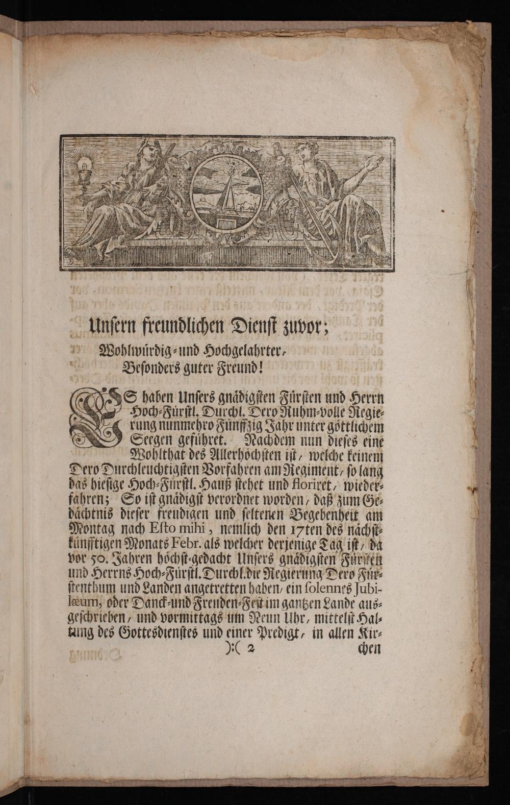 Ordnung des öffentlichen Gottesdienstes in Giessen : an dem Gnädigst angeordneten Jubilæo oder Danck- und Freuden-Fest, als der Durchläuchtigste Fürst und Herr, Herr Ernst Ludwig, Landgraf zu Hessen, Fürst zu Herßfeld, Graf zu Catzenelnbogen, Dietz, Ziegenhain, Nidda, Schaumburg, Ysenburg und Büdingen [et]c. Unser Gnädigster Fürst und Herr, das Ein und Fünffzigste Jahr Ihro Hoch-Fürstl. Durchl. glorwürdigstgeseegneten Landes-Regierung den 17ten Febr. 1738. angetretten, und dieser recht merckwürdige Tag in sämtlichen Hoch-Fürstl. Hessen-Darmstättischen Landen feyerlichst begangen wurde : nebst einer deßfals vorgeschiebenen Dancksagung und Gebet, welche auf die gnädigst-verordnete Texte gerichtet, und auf allen Cantzeln des Ober-Fürstenthums zu gebrauchen / Ex speciali Commissione des Fürstl. Consistorii dem Druck übergeben von D. Johann Georg Liebknecht, Prof. publ. ord. Superintendente, wie auch den Consistorii daselbst Assessore