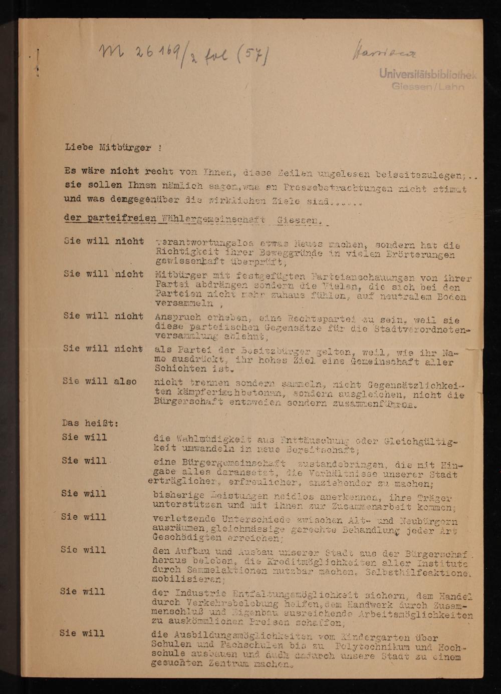 [Ziele der parteifreien Wählergemeinschaft Giessen] / ihre parteifreie Wählergemeinschaft Gießen