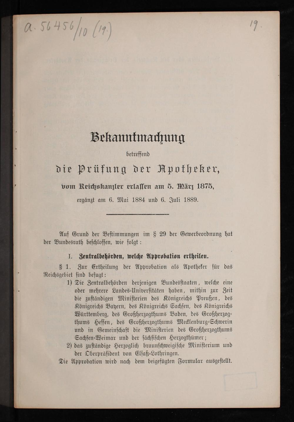 Bekanntmachung betreffend die Prüfung der Apotheker, vom Reichskanzler erlassen am 5. März 1875, ergänzt am 6. Mai 1884 und 6. Juli 1889 / Bundesrath
