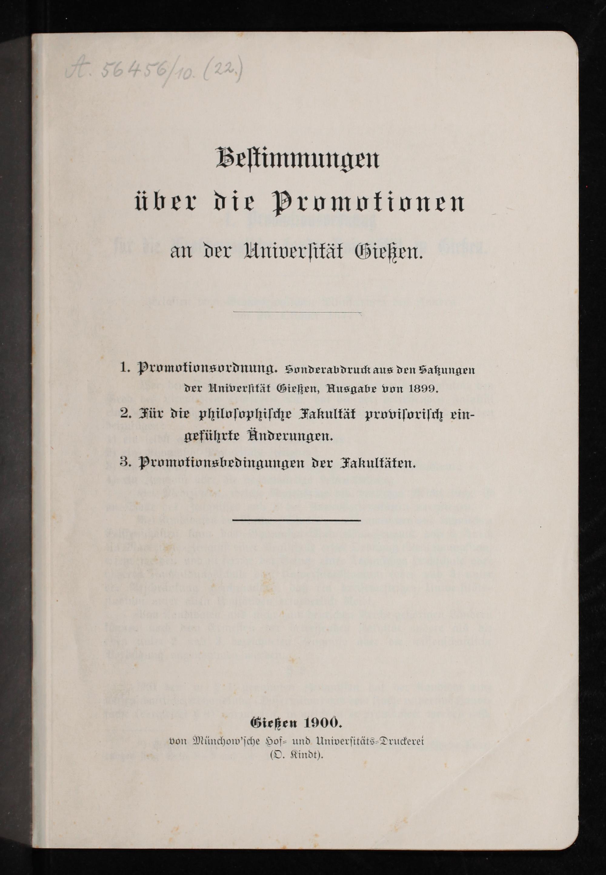 Bestimmungen über die Promotionen an der Universität Gießen / erlassen vom Großherzoglichen Ministerium des Innern am 20. Oktober 1877