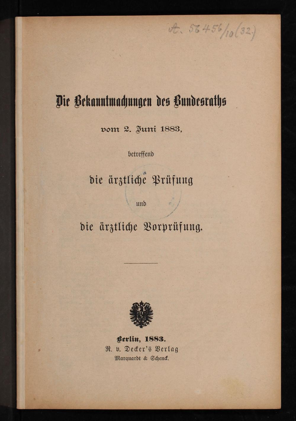 Die Bekanntmachungen des Bundesraths vom 2. Juni 1883, betreffend die ärztliche Prüfung und die ärztliche Vorprüfung / [Deutsches Reich. Bundesrat]