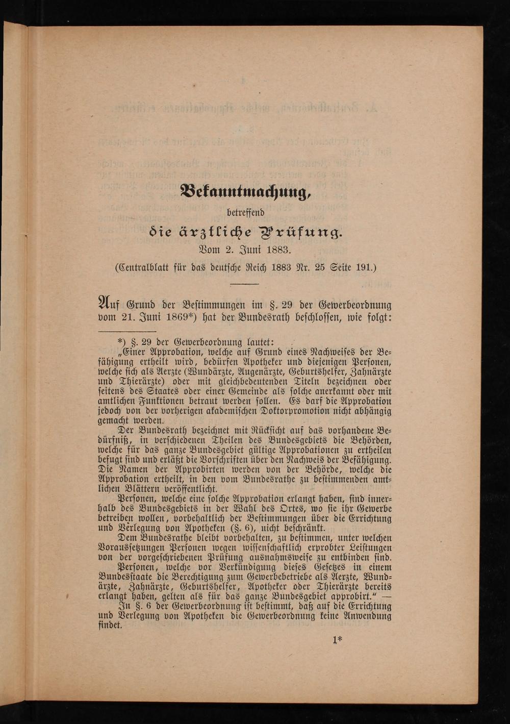 Die Bekanntmachungen des Bundesraths vom 2. Juni 1883, betreffend die ärztliche Prüfung und die ärztliche Vorprüfung