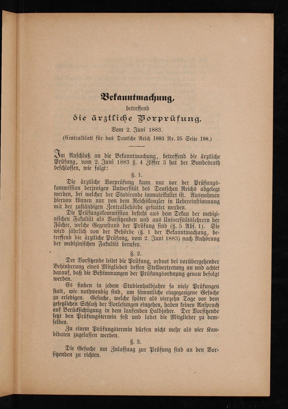 Die Bekanntmachungen des Bundesraths vom 2. Juni 1883, betreffend die ärztliche Prüfung und die ärztliche Vorprüfung