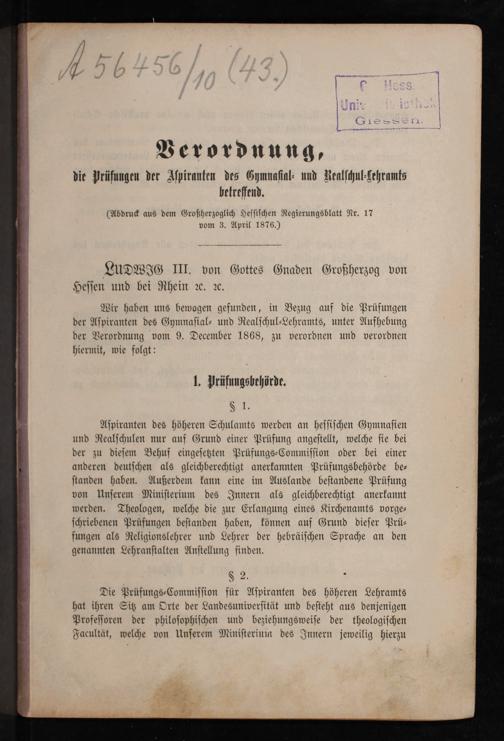Verordnung, die Prüfungen der Aspiranten des Gymnasial- und Realschul-Lehramts betreffend : (Abdruck aus dem Großherzoglich Hessischen Regierungsblatt Nr. 17 vom 3. April 1876) / (L. S.) Ludwig, v. Starck